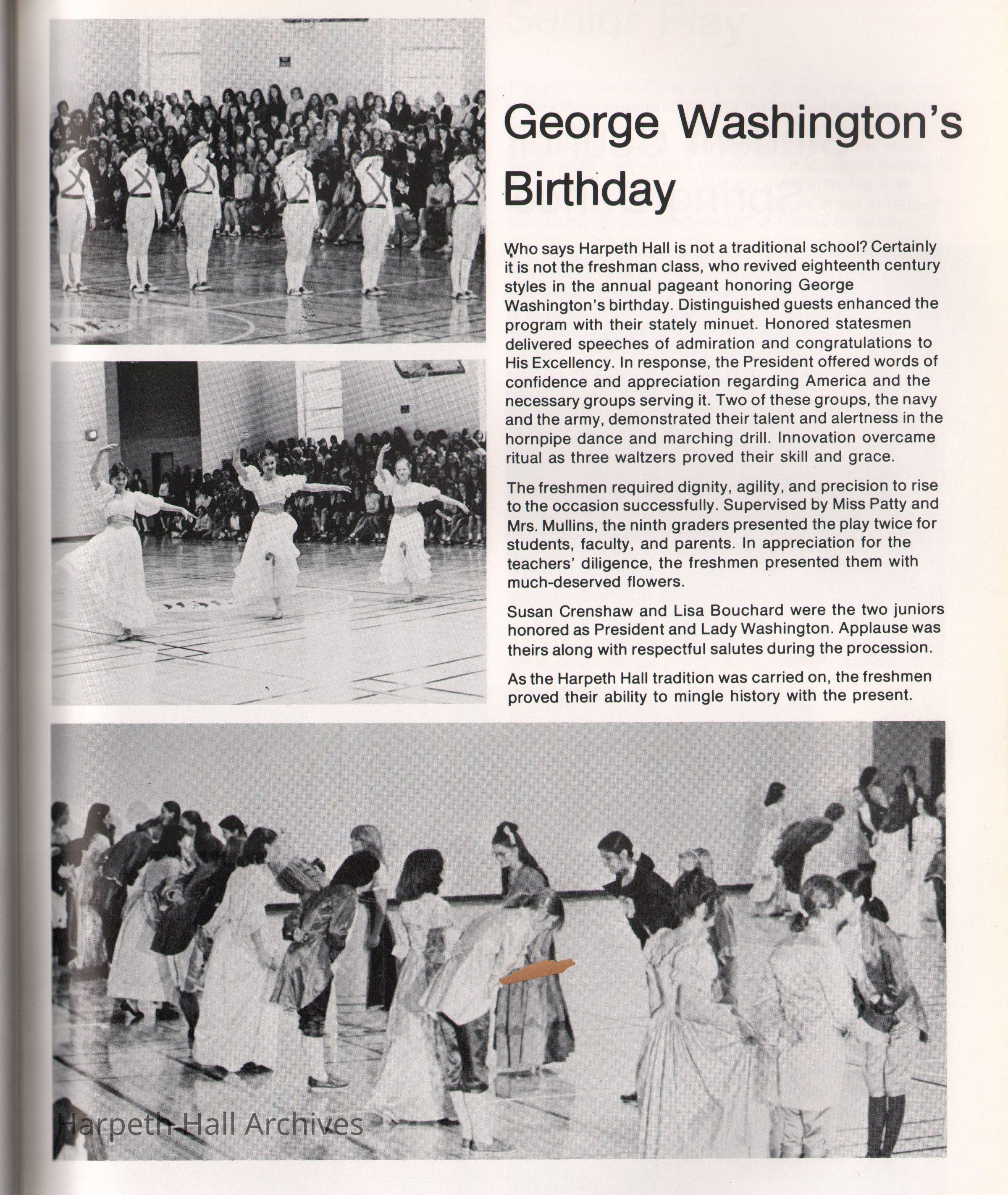 The George Washington Day Celebration was a tradition that began at Belmont College for Young Women, developed into a costume ball and dance at Ward-Belmont, and was transferred to Harpeth Hall, where it continued as a special all-school program performed by Middle School students until 2020.Relationships