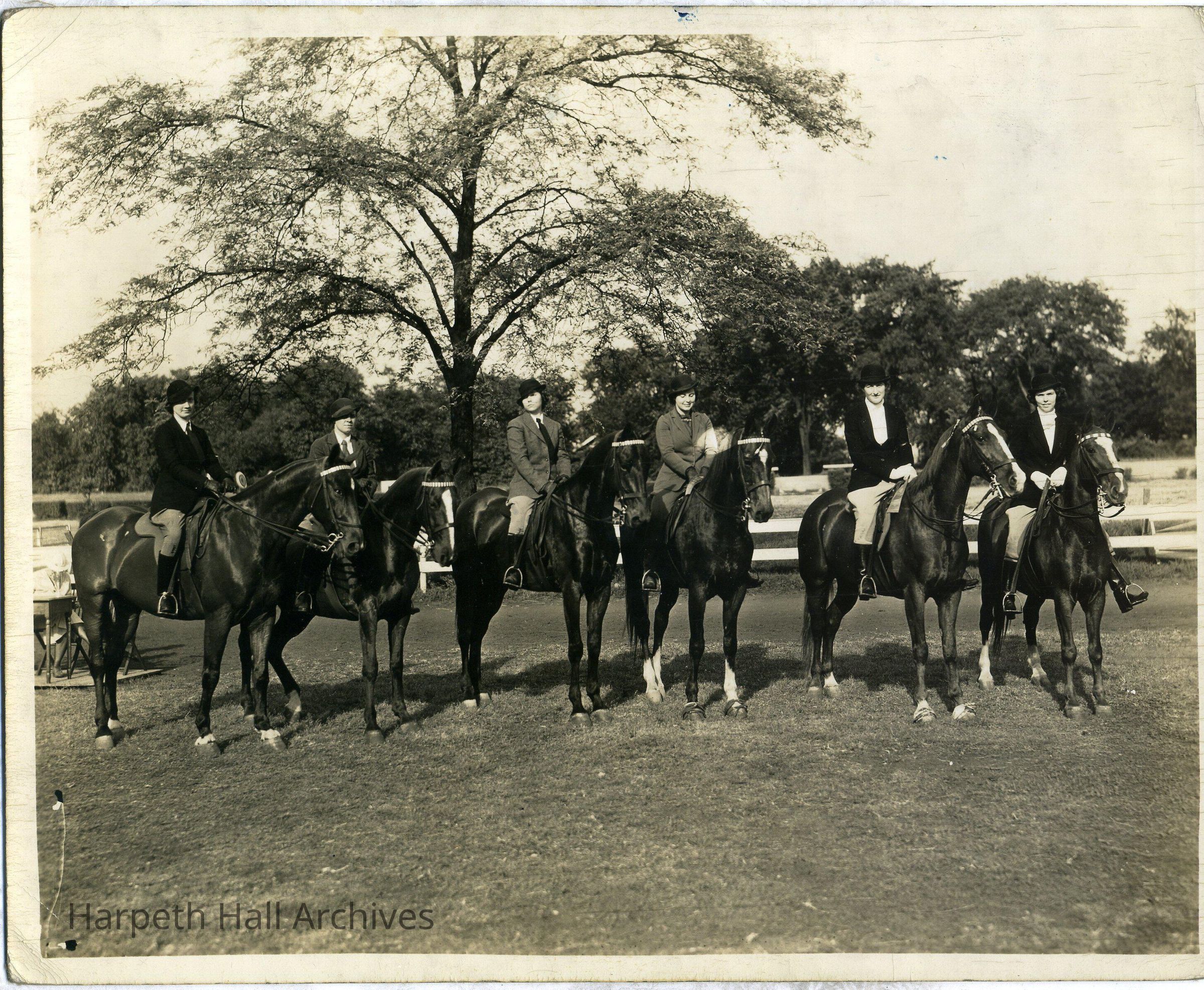 6 ladies on horses, standing still. One of 3 identical photos, stored in same plastic sleeve.