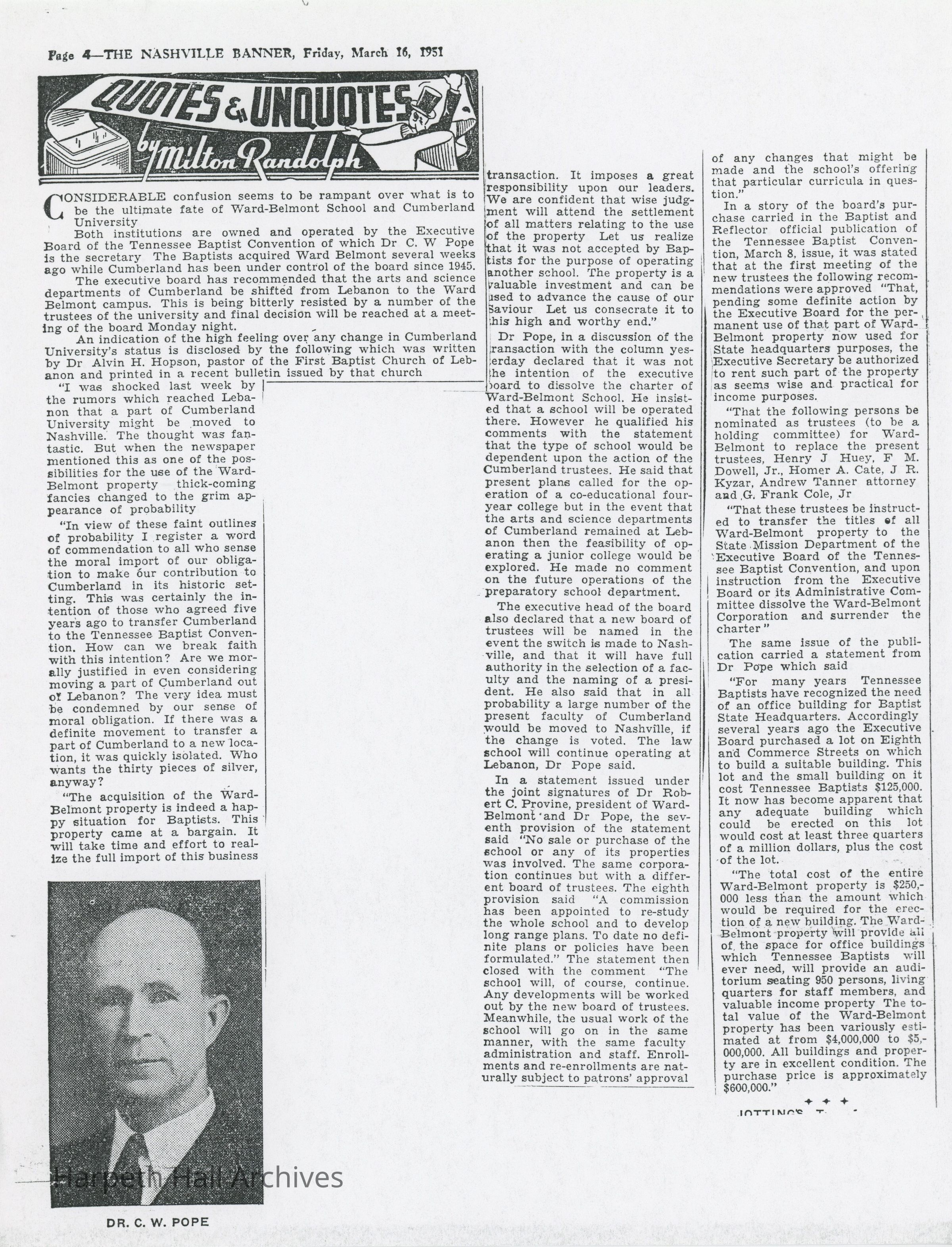 Nashville Banner article about Ward-Belmont's and Cumberland University's fates.