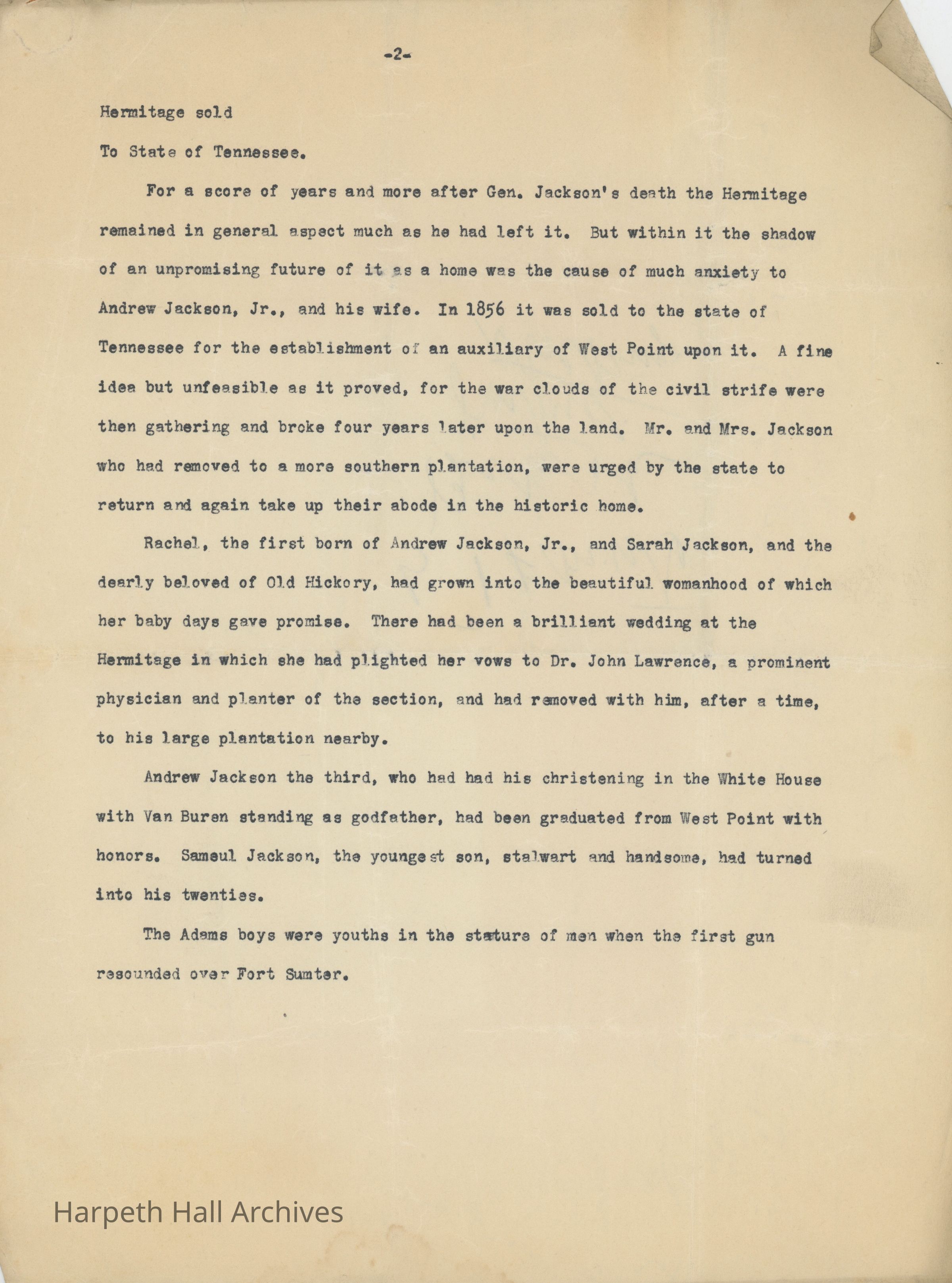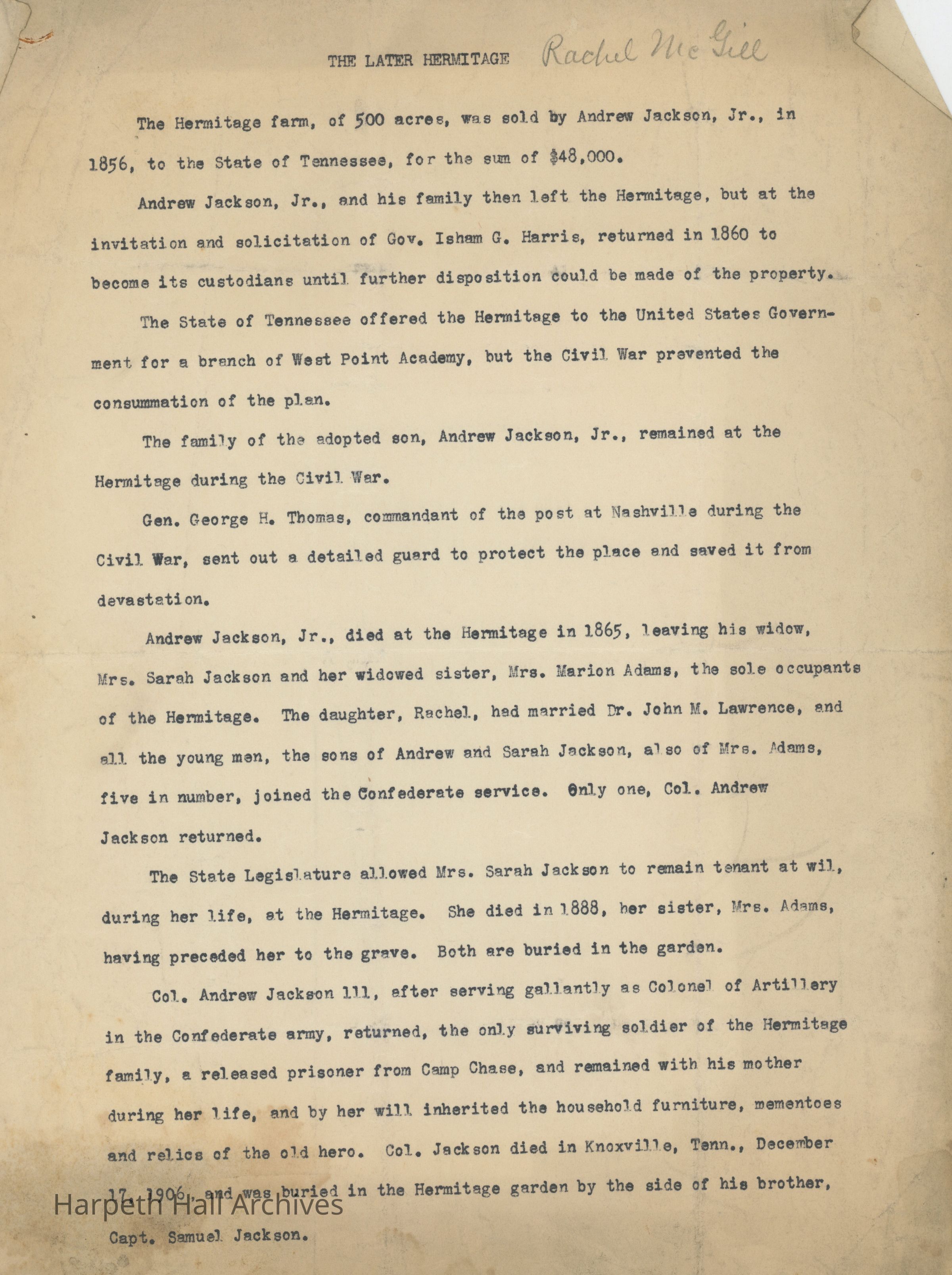 A two-page document detailing the sale and later history of The Hermitage, and that of Andrew Jackson's family and descendants.Context