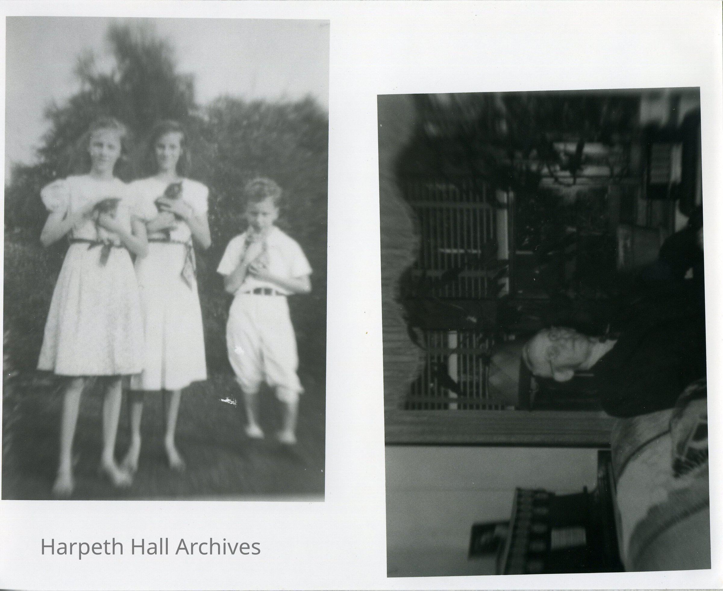 ON the left is a photo of 2 girls, and one boy, each holding a kitten. The one on the right is of a gentleman sitting on a couch in a living room.