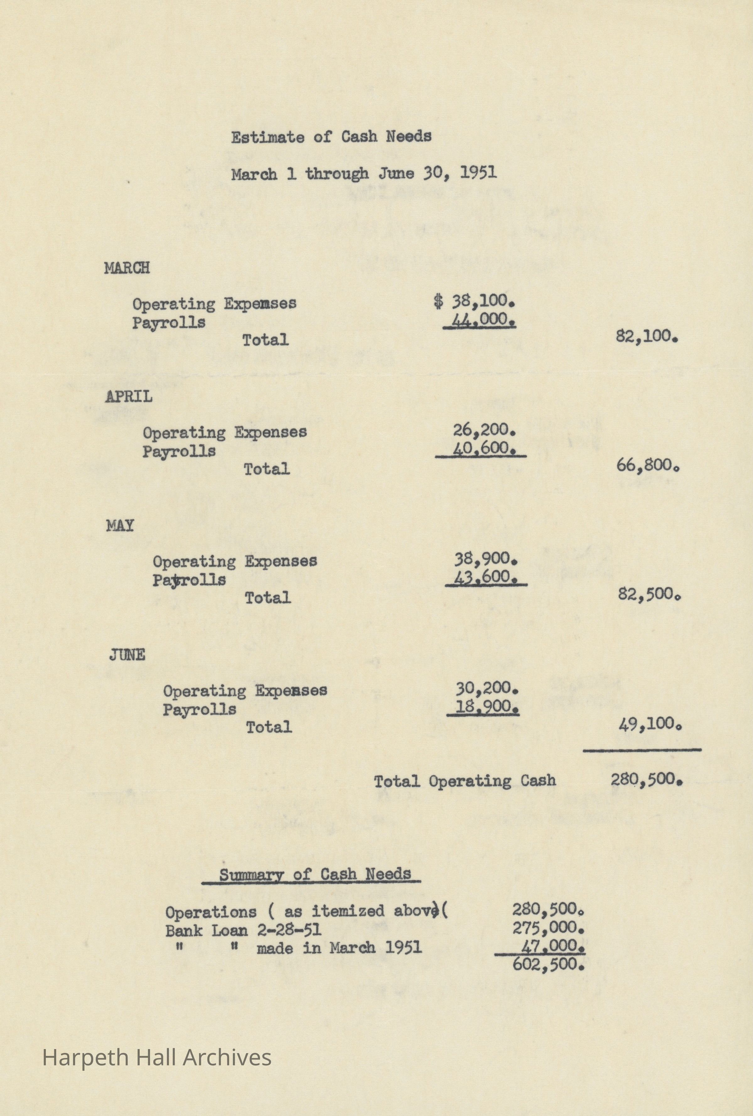An estimate of the funds needed for the operation of Ward-Belmont from March 1 to June 30, 1951. The estimate of operating needs is $280,500.Collection