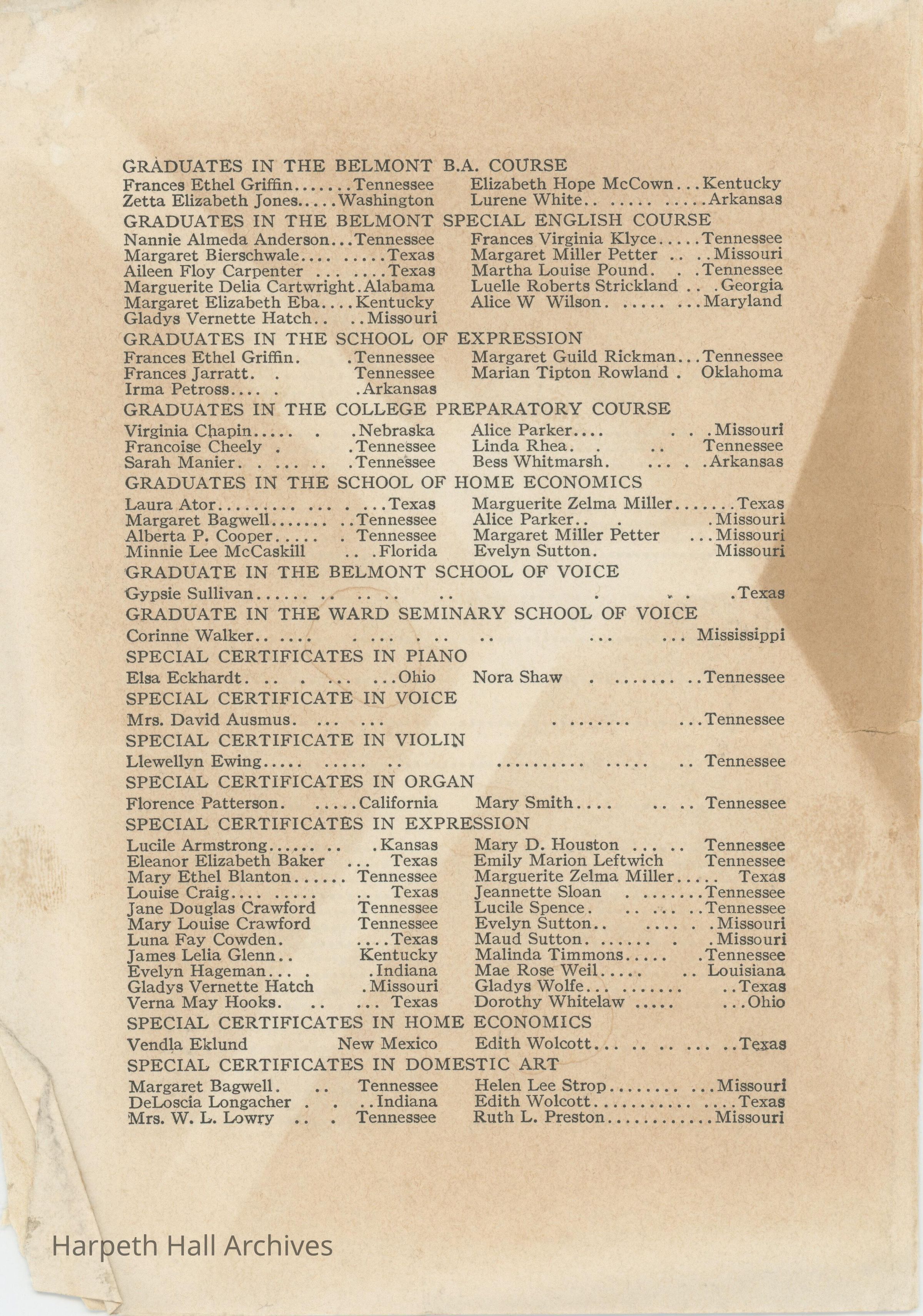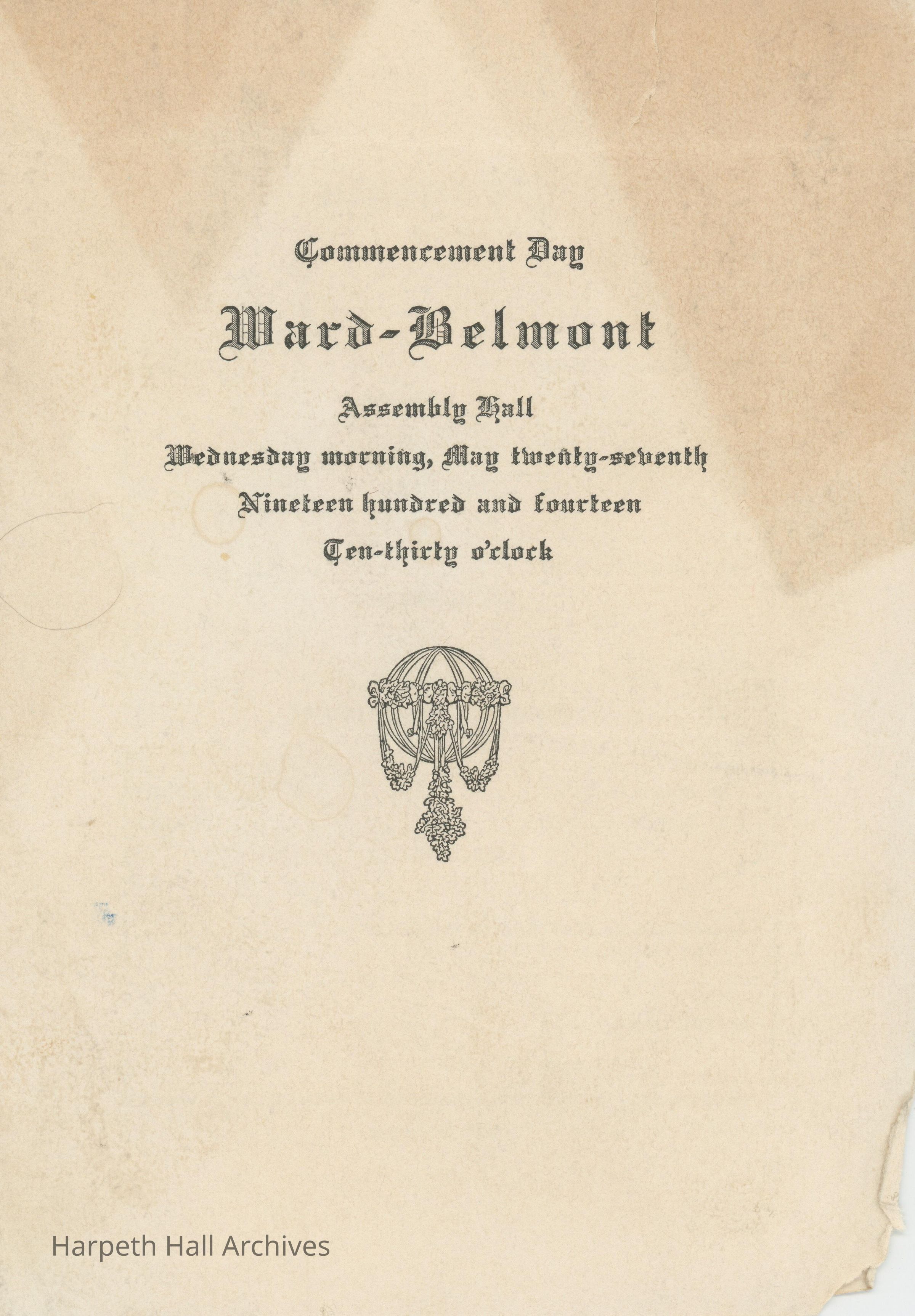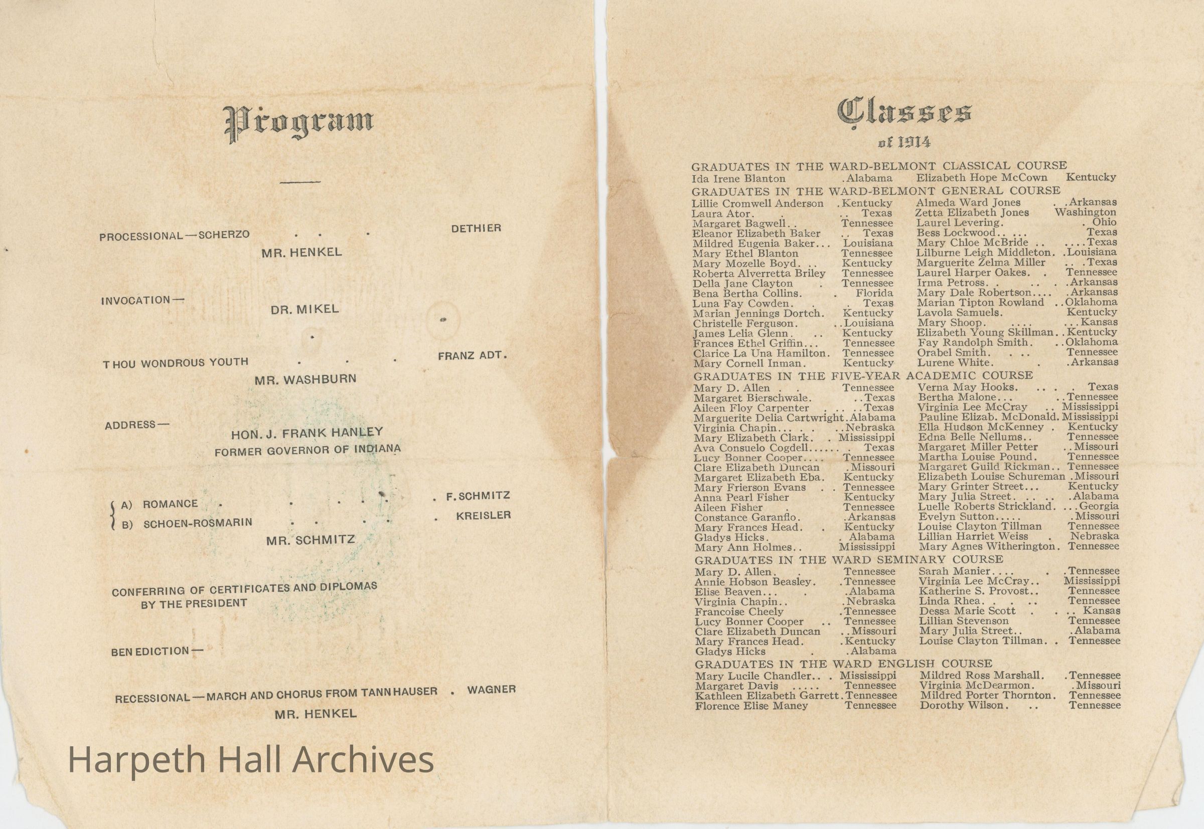 A program for the 1914 Ward-Belmont Commencement Day ceremony. Held in the assembly hall on Wednesday morning, May 27, 1914, at 10:30. The program included a processional, invocation, music, an address from Hon. J. Frank Hanley (former governor of Indiana), the conferring of certificates and diplomas by the school president, benediction, and recessional. The graduating classes of 1914 are listed as follows: graduates in the Ward-Belmont classical course, the Ward-Belmont general course, the five-year academic course, the Ward Seminary course, the Ward English course, the Belmont B.A. course, the Belmont Special English course, the school of expression, the college preparatory course, and the school of home economics. Two individual graduates were from the Belmont school of voice and the Ward Seminary school of voice. Special certificates were issued in piano, voice, violin, organ, expression, home economics, and domestic art.Collection