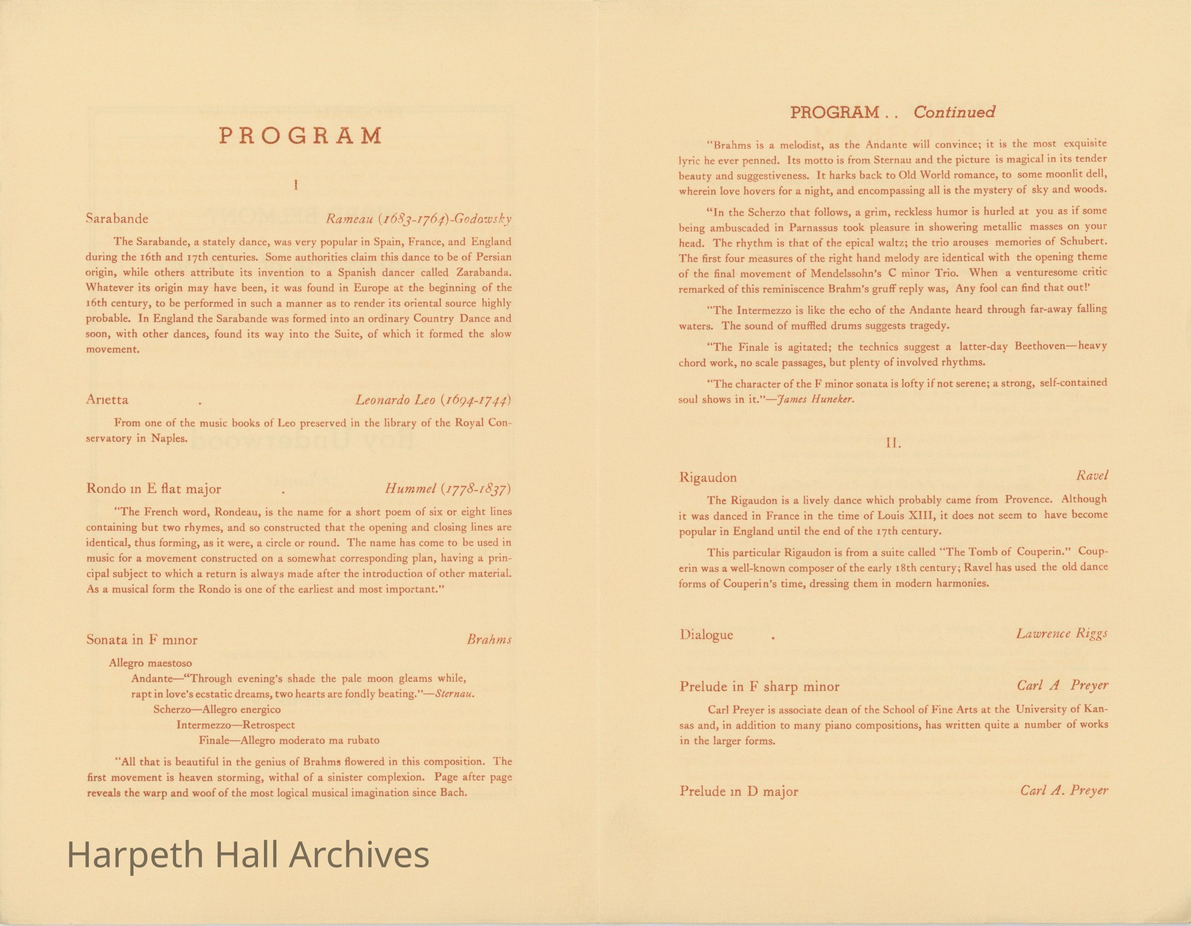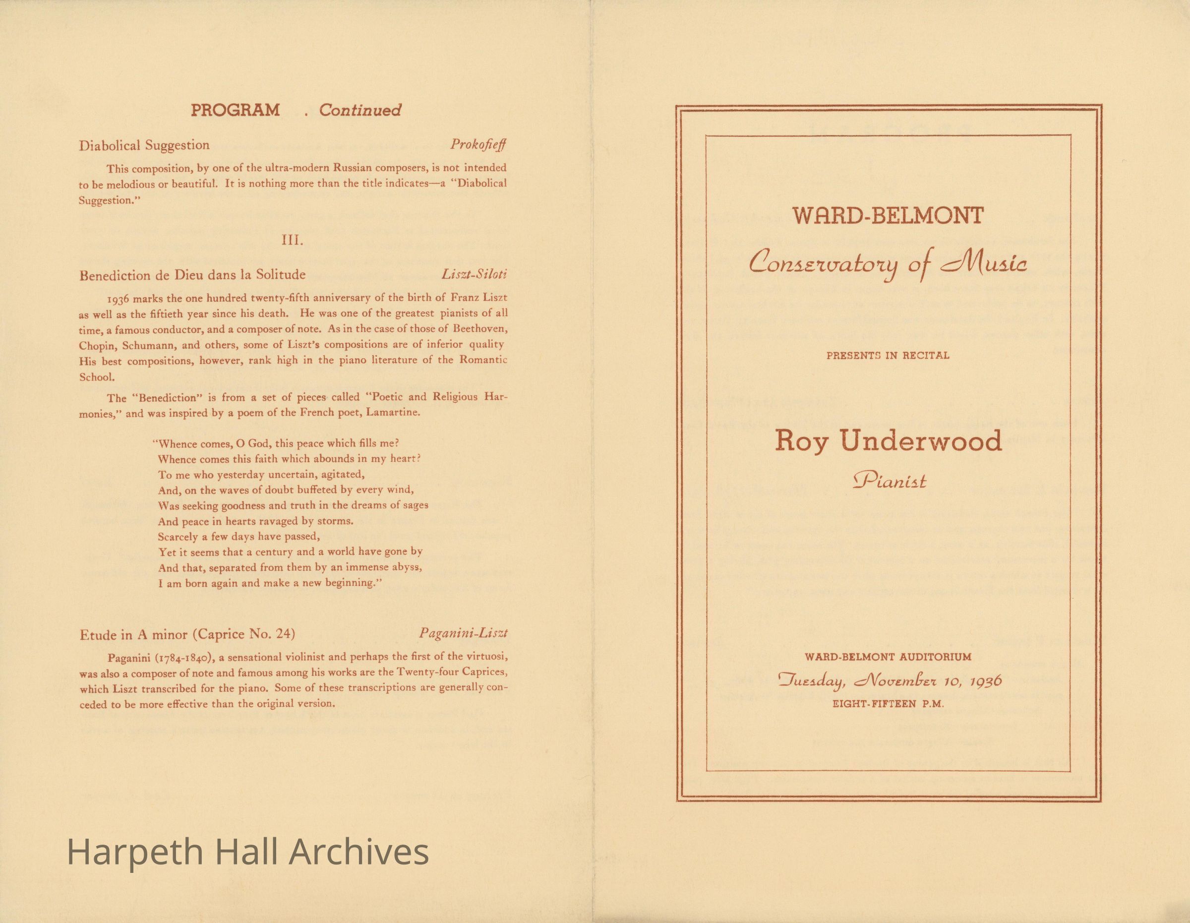 The program for the Roy Underwood Piano Concert on November 10th, 1936. The concert was presented by the Ward-Belmont Conservatory of Music. Mr. Underwood was the head of the Piano department at Ward-Belmont.Collection