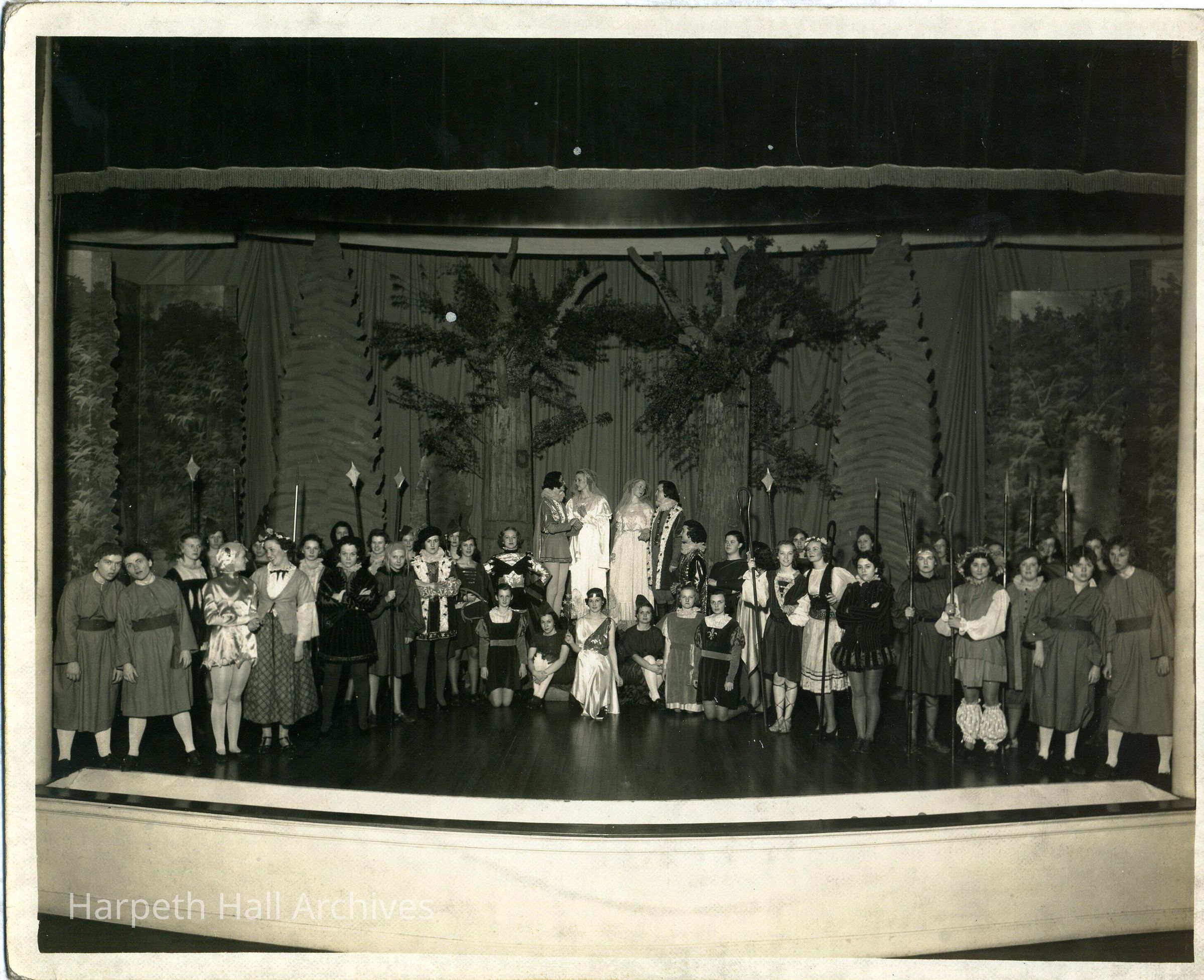 Ward-Belmont and Castle Heights Military Academy(?) performers in costume posing on stage. The play is "As You Like It."