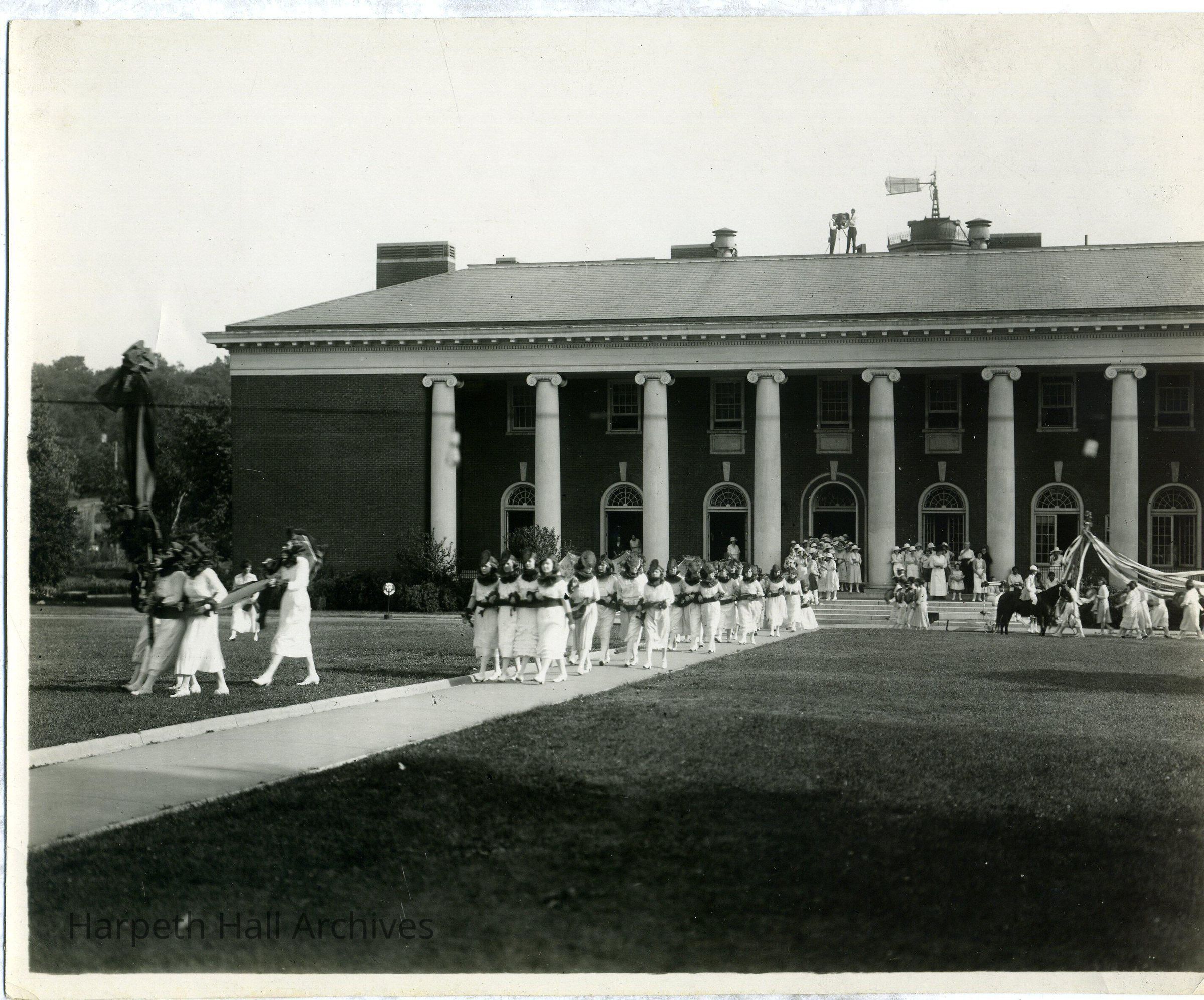 ladies dressed in white, parading on May Day. Building with pillars is in background. It appears that the arms of the girls are linked together with a large ribbon. In the background a May Pole and horse are visible. Two men can be seen on the roof of the building, possibly taking a picture.