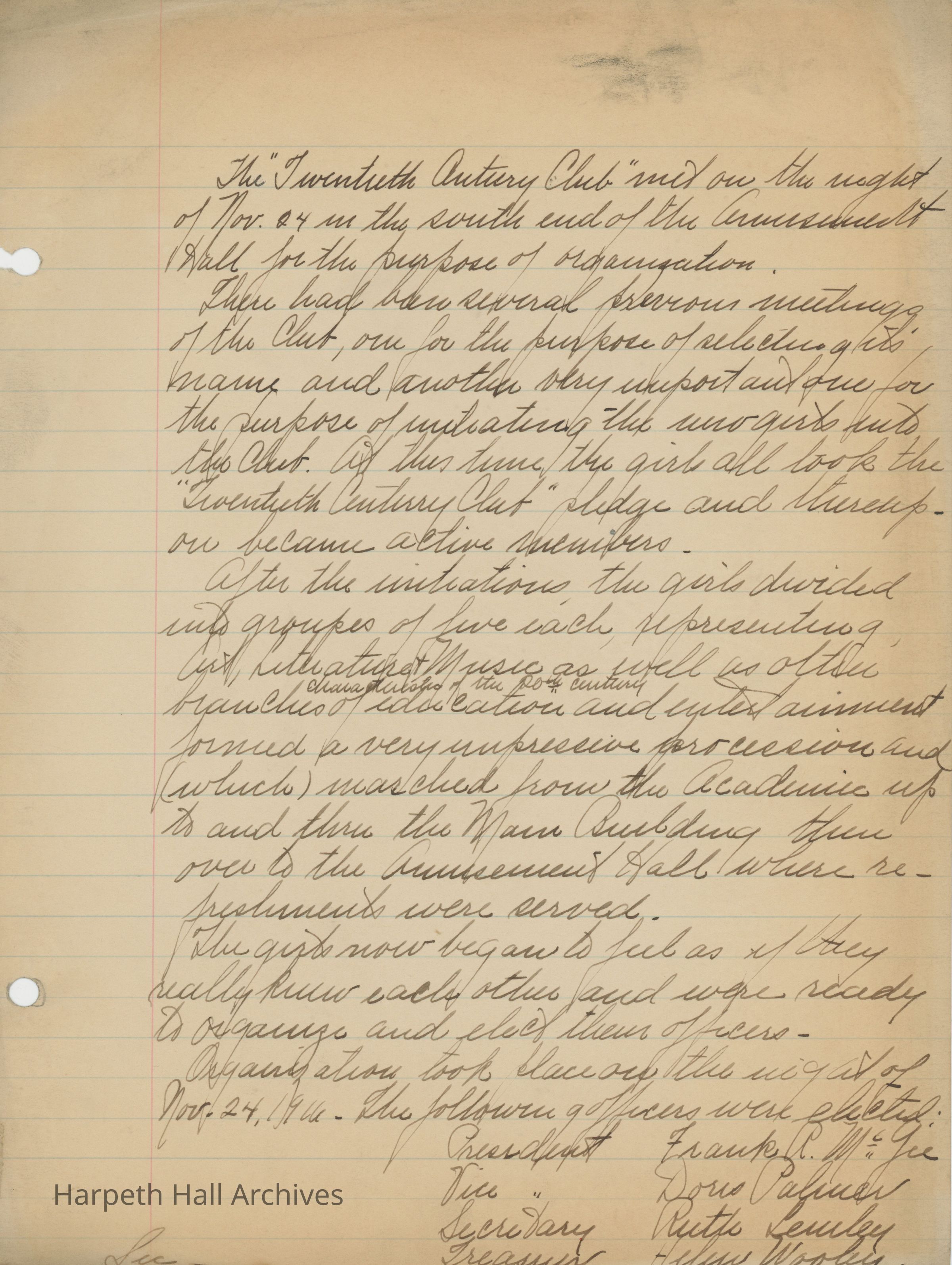Handwritten minutes for the founding meetings of the Twentieth Century Club of Ward-Belmont. The club's first official meeting on November 24, 1916 is discussed, as well as previous meetings at which the club's name was decided and new members were initiated. After separating into their club groups and processing from the Academic Building through the Main Building and then to Amusement Hall for refreshments, "the girls now began to feel as if they really knew each other and were ready to organize and elect their officers." The T.C.C.'s first officers were elected on November 24, 1916: Frank McGee as President, Doris Palmer as Vice-President, Ruth Lemley as Secretary, and Helen Wooley as Treasurer.