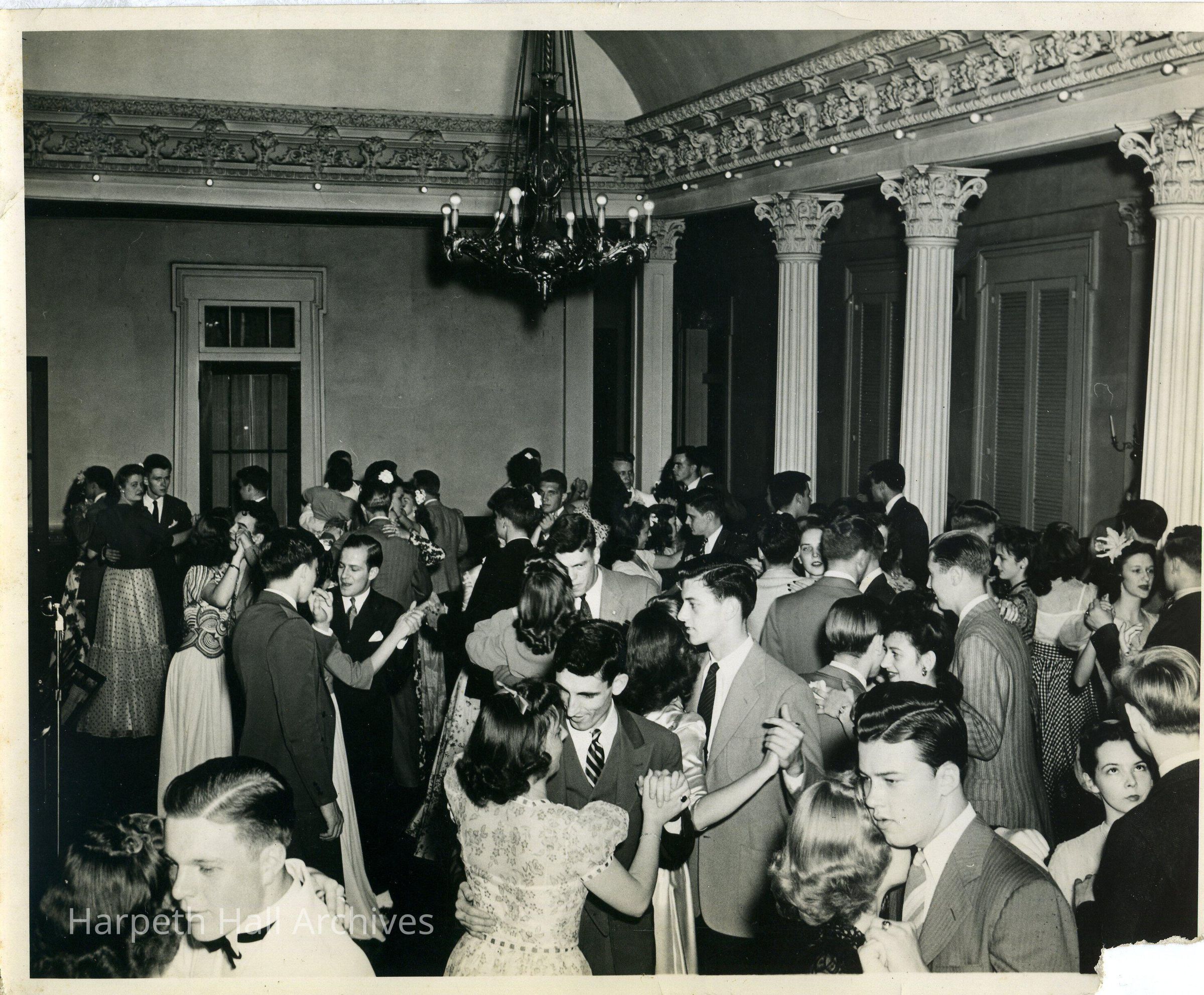 photo of a dance/party. Small tear at bottom right corner. Couples in semi-formal attire dancing in a room with ornate columns and ceilings with a chandelier visible. Penciled on back is "44-6".