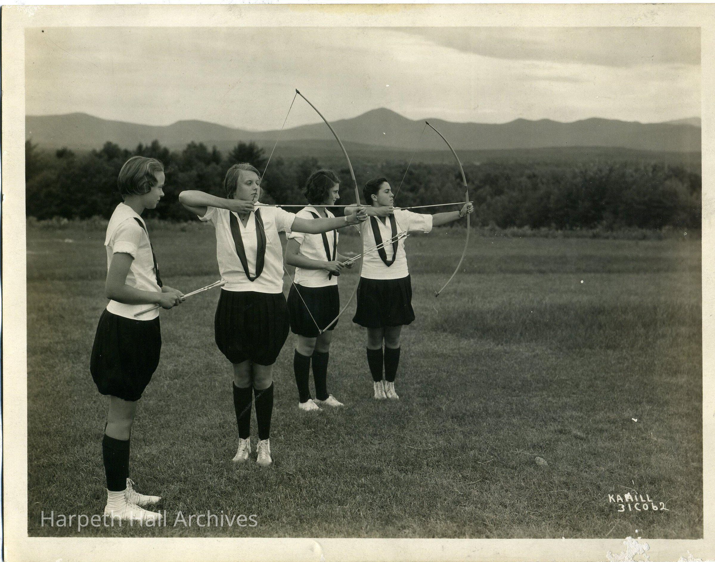 photo of 4 girls participating in archery. Written on the back of photo: Camp Cochee in Maine, Miss Morrison's Carp (?)