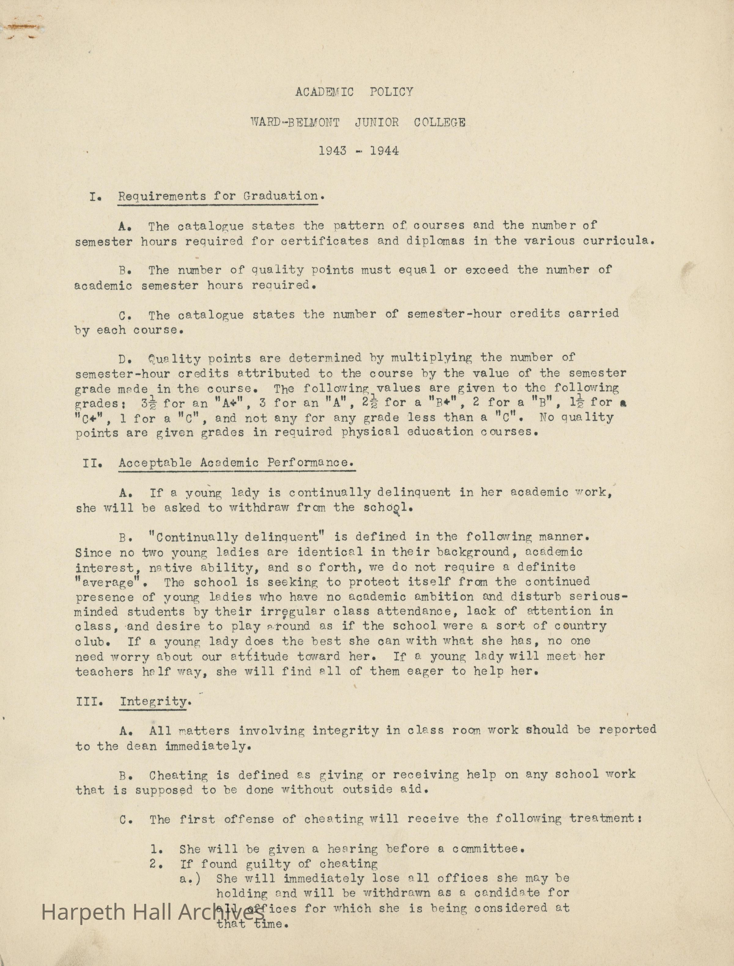 The academic policy for Ward-Belmont Junior College for the 1943-1944 school year.Collection