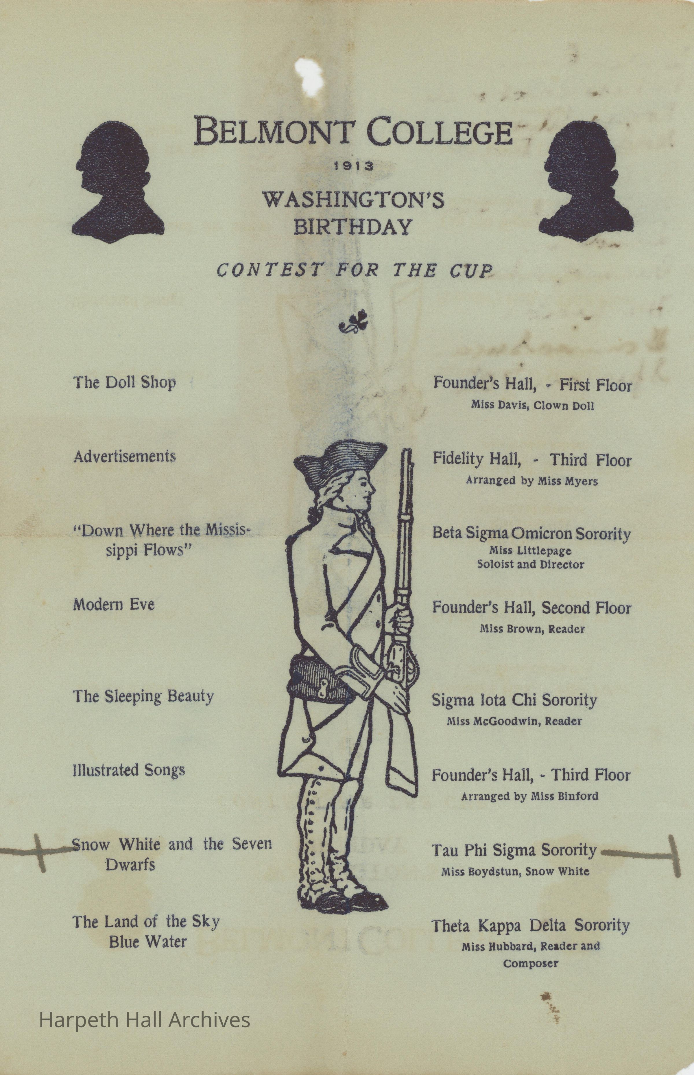 A Belmont College 1913 Contest for the Cup program to celebrate George Washington’s birthday. Performers include Founder’s Hall - First Floor with Miss Davis as Clown Doll, Fidelity Hall - Third Floor arranged by Miss Myers, Beta Sigma Omicron Sorority with soloist and director Miss Littlepage, Founder’s Hall - Second Floor with Miss Brown as a reader, Sigma Iota Chi Sorority with Miss McGoodwin as a reader, Founder’s Hall - Third Floor arranged by Miss Binford, Tau Phi Sigma Sorority with Miss Boydstun as Snow White, and Theta Kappa Delta Sorority with Miss Hubbard as a reader and composer. Acts include The Doll Shop, Advertisements, “Down Where the Mississippi Flows”, Modern Eve, Illustrated Songs, Snow White and the Seven Dwarfs, and The Land of the Sky Blue Water. Specific advertisements are written on the back of the publication.Collection