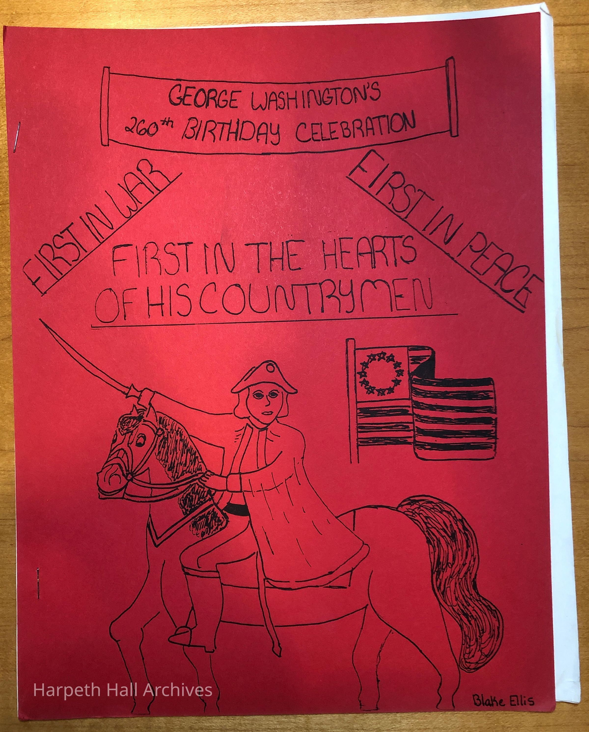The 1992 program for the George Washington Day Celebration put on by the class of 1997 when they were in the seventh grade. George Washington was played by eighth grader Brianne Frazier (1996) and Martha Washington was played by eighth grader Jennifer Kain Richardson (1996). Front cover design by Blake Ellis Hays (1997).Context