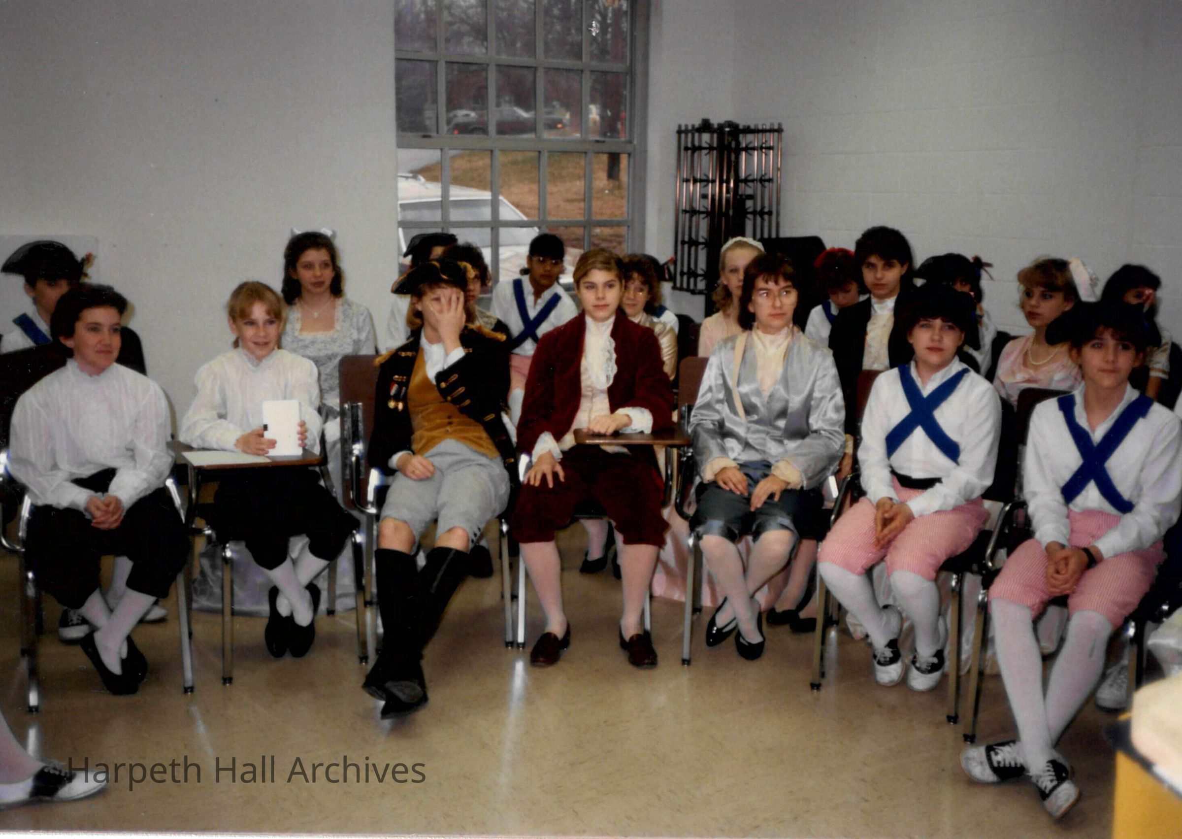 Students in costume preparing for the George Washington Day Celebration.Context