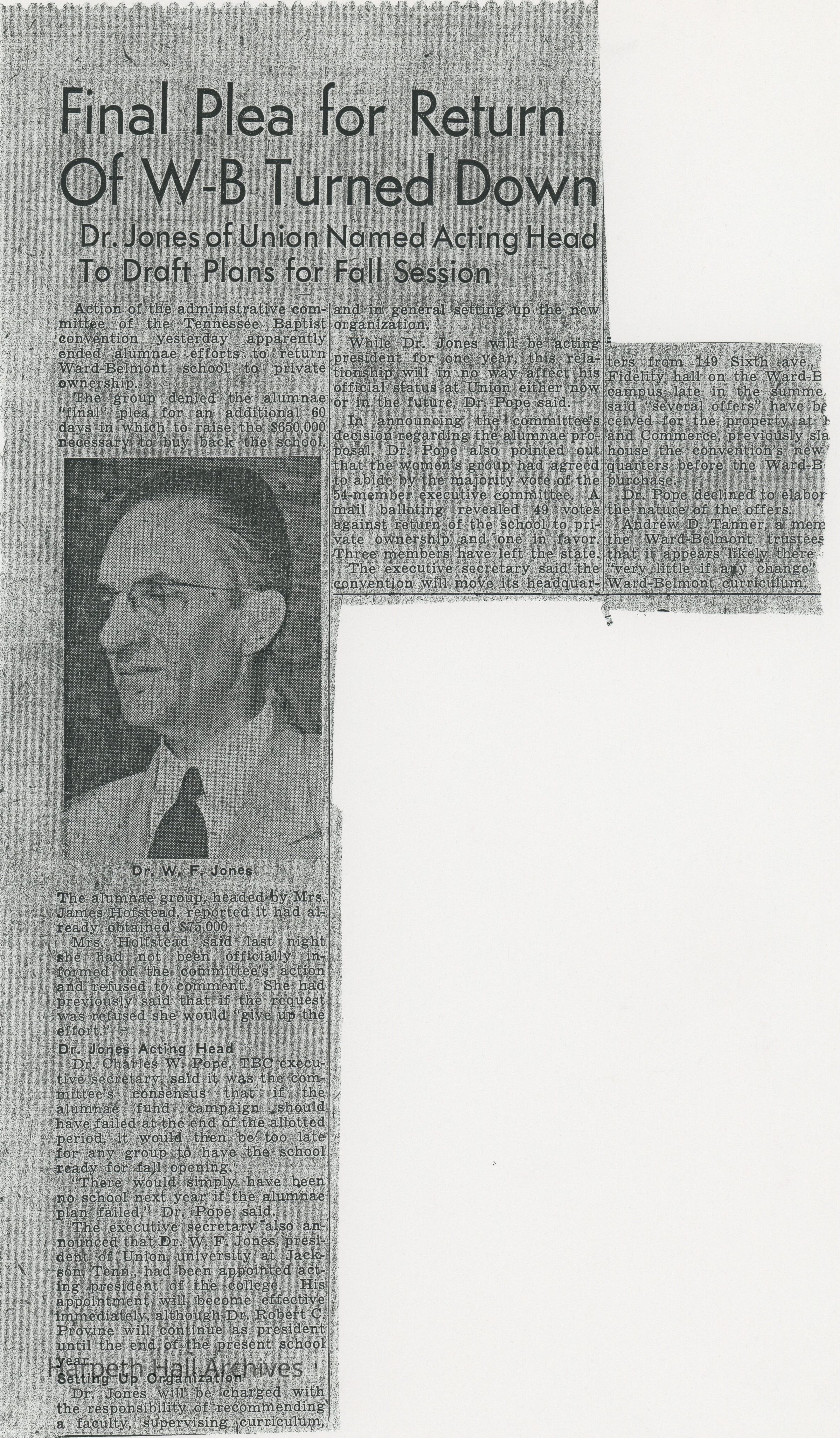 Article on Ward-Belmont officially staying under the Tennessee Baptist Convention's control.