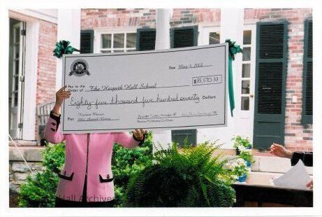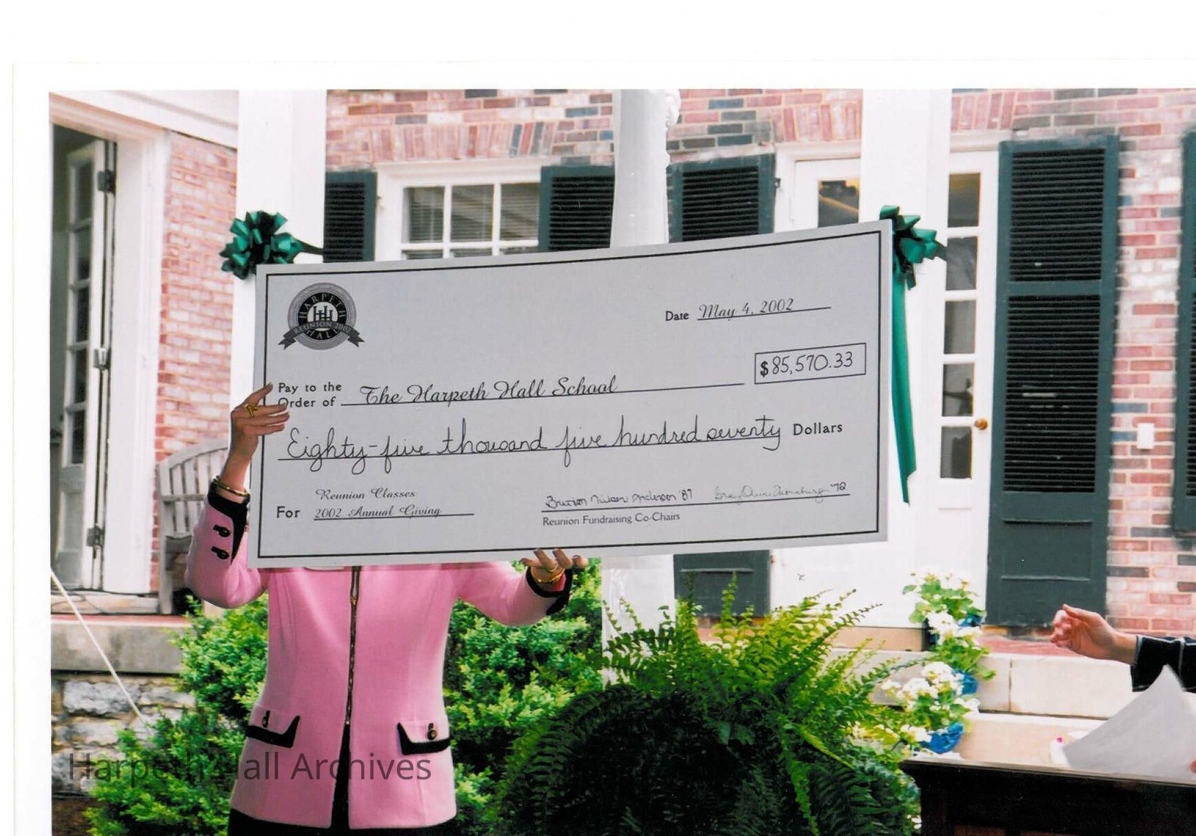 Ann Teaff (Head of School 1998-2014) holding up a check presented to HH from Reunion Classes of 2002 for $85,570.33 at the Grand Alumnae Luncheon on May 4th, 2002 behind Souby Hall at the Harpeth Hall School