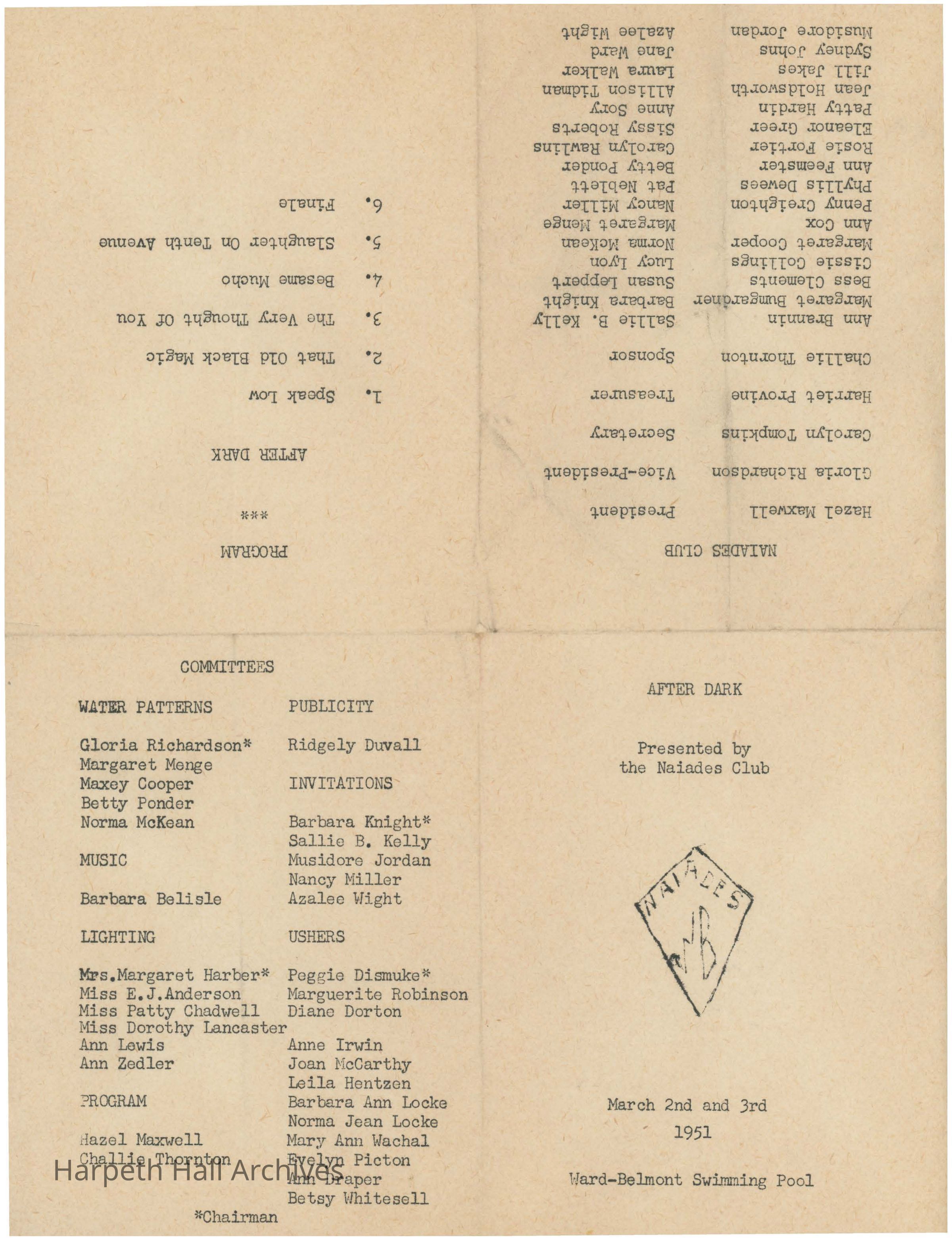 Maxwell (Rust), Hazel Lamb (Hazell) 1951, Gloria Richardson, Tompkins (Young), Carolyn (Carolyn) 1951, Provine (Provine), Harriet Thoms (Harriet) 1951, Thornton (Thornton), Challie (Challie) 1948, Branmin (Weber), Ann (Ann), Margaret Bumgardner, Clements (Abell), Elizabeth Highers (Bess) 1951, Cissie Collings, Margaret Cooper, Cox (Burns), Mildred Ann (Ann) 1951, Creighton (Dewell), Penelope Bates (Penny) 1952, Dewees (Conley), Phyllis (Phyllis) 1952, Ann Feemster, Rosie Fortier, Greer (Drake), Eleanor (Eleanor), Hardin (Hardin), Patty Wood (Patty) 1951, Jean Holdsworth, Jakes (Jakes), Jill (Jill) 1952, Sydney Johns, Musidore Jordan, Sallie B. Kelly, Barbara Knight, Leppert (Fry), Susan (Susan) 1951, Lucy Lyon, McKean (Sessions), Norma Rae (Norma) 1951, Margaret Menge, Miller (Jenkins), Nancy (Nancy), Neblett (Moran), Patsy (Pat) 1951, Ponder (Harrison), Elizabeth (Betty) 1951, Carolyn Rawlins, Roberts (McAlister), Sissy (Sissy) 1951, Sory (Sory), Anne Long (Anne) 1951, Tidman (Beasley), Allison T. (Allison) 1951, Laura Walker, Ward (Ward), Jane Hampton (Jane) 1951, Azalee Wright
