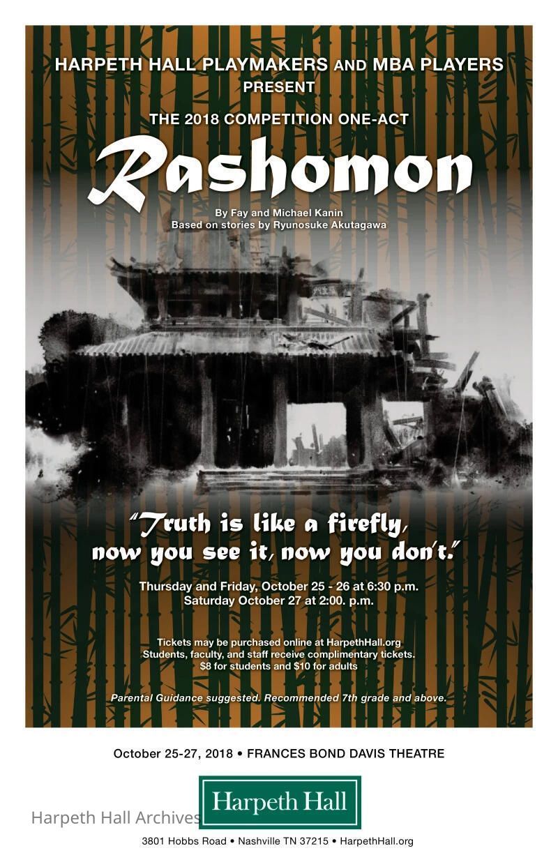 The playbill for the showing of Rashomon put on by the Harpeth Hall Playmakers in October of 2018.