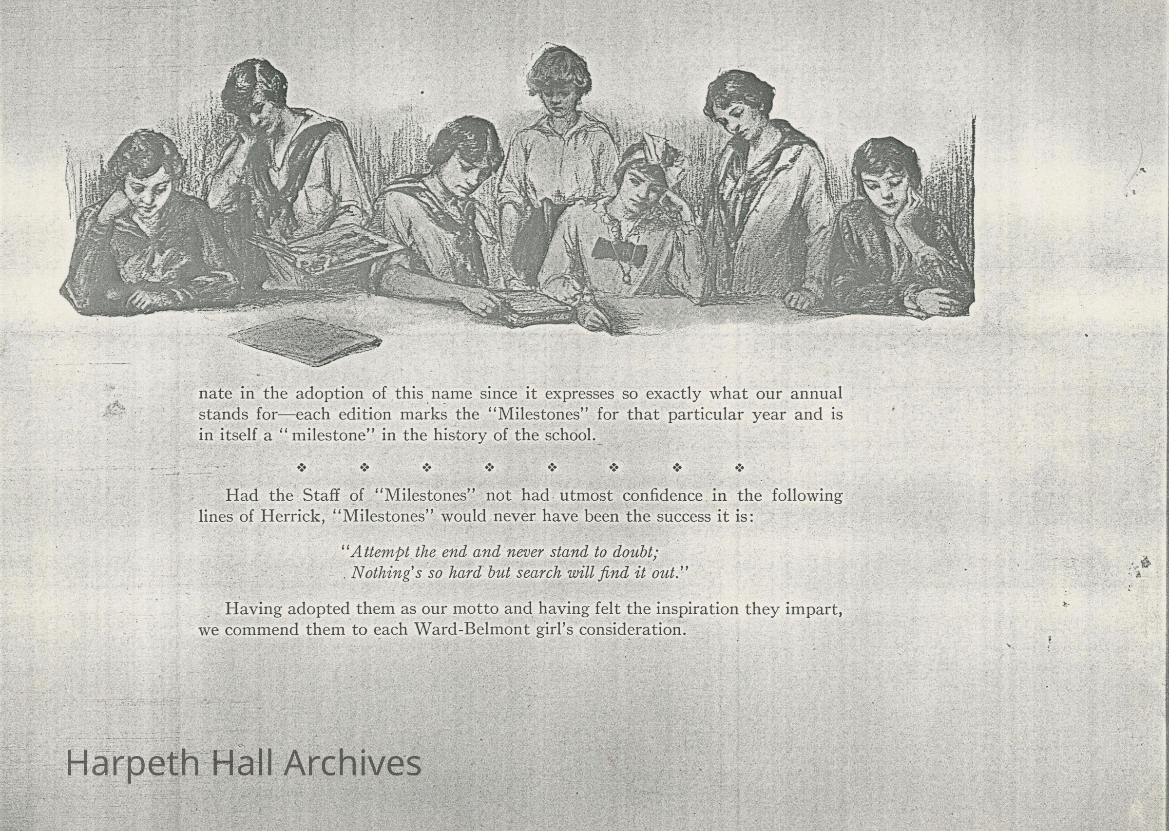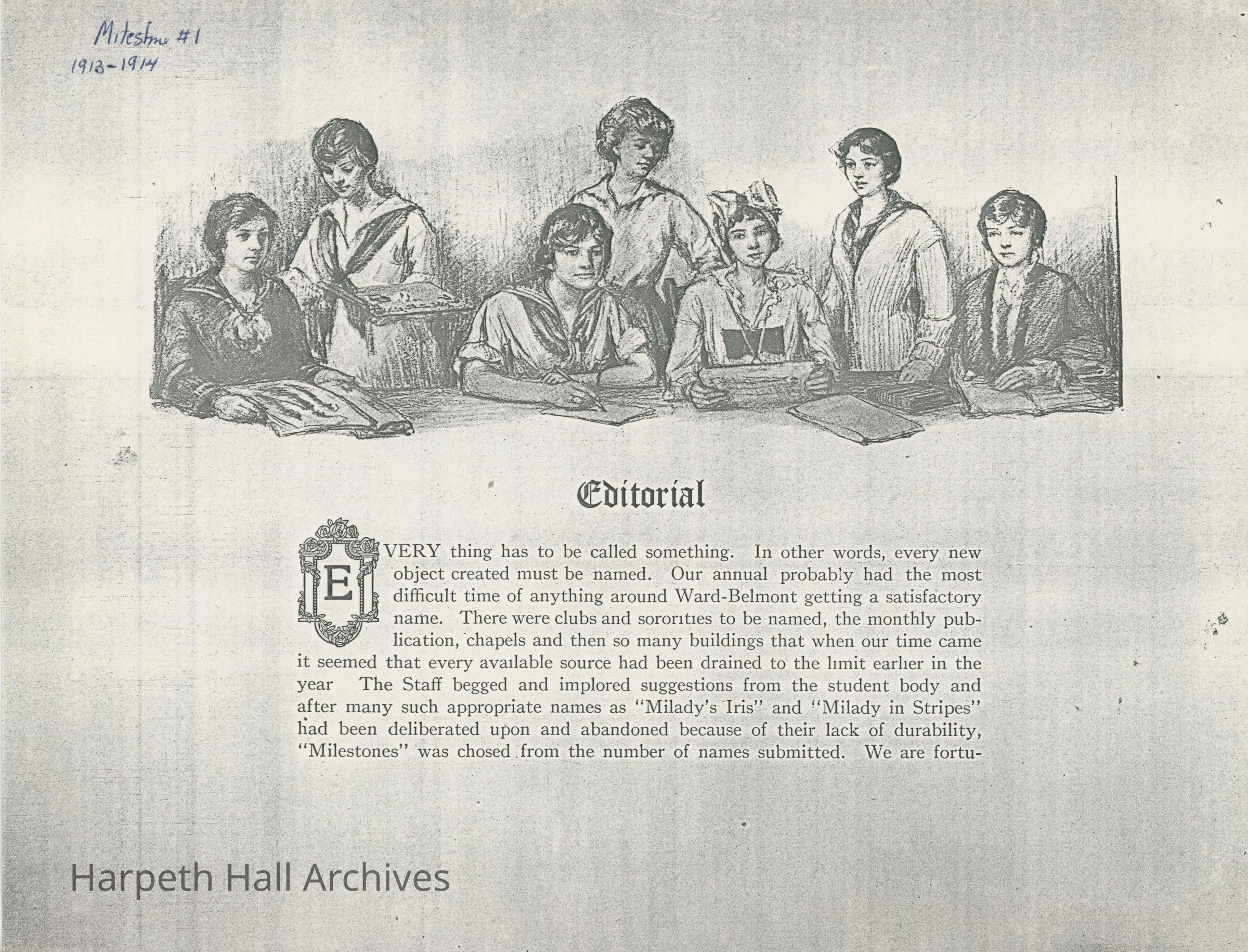 The editorial from the first Ward-Belmont yearbook from the 1913-1914 schoolyear explaining the meaning behind the name 'Milestones.'Collection