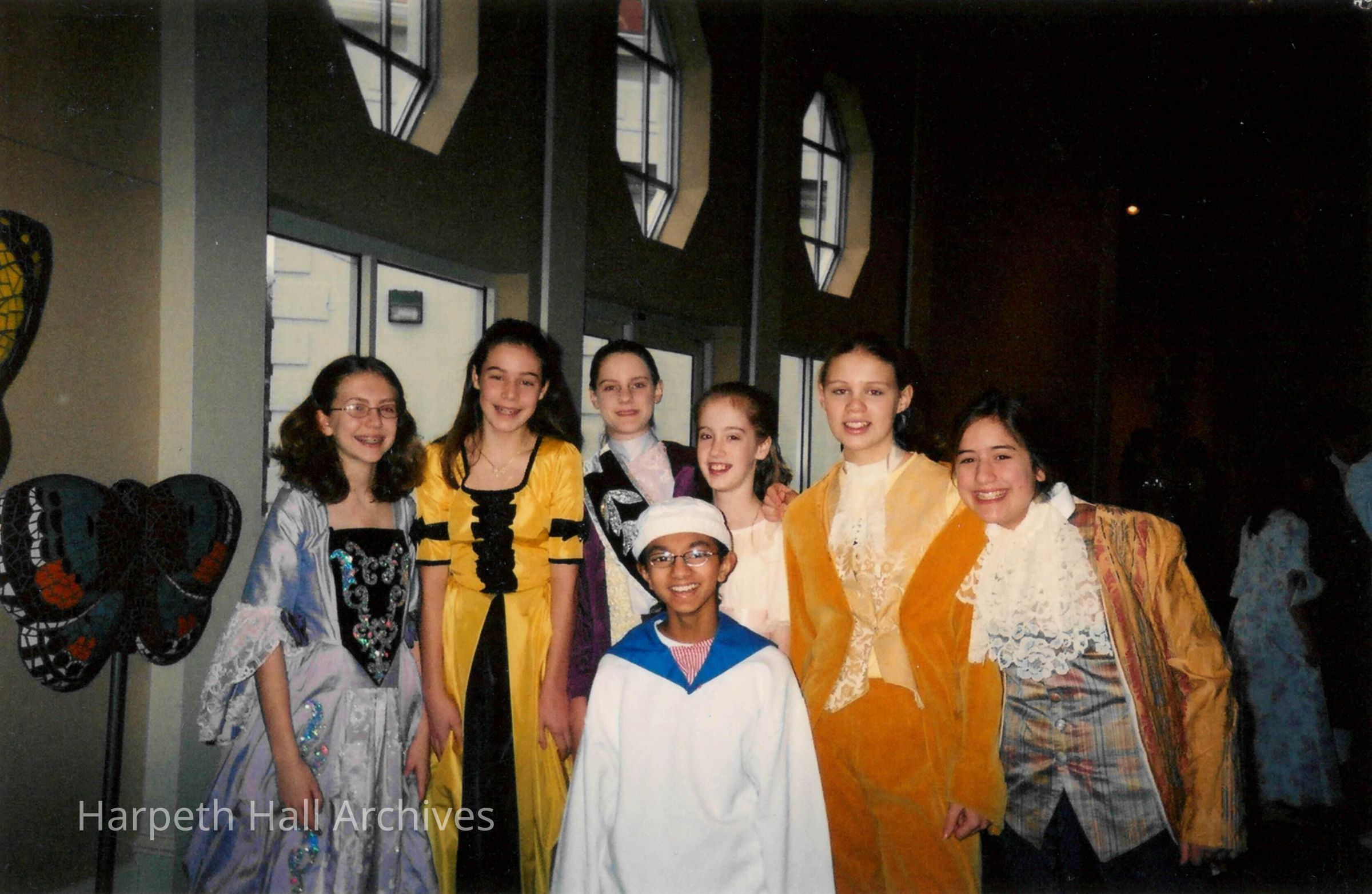 A group of seventh grade students posing in costume after the George Washington Day Celebration. The photo is taken in the Marnie Sheridan Gallery in the McMurry Center.Context