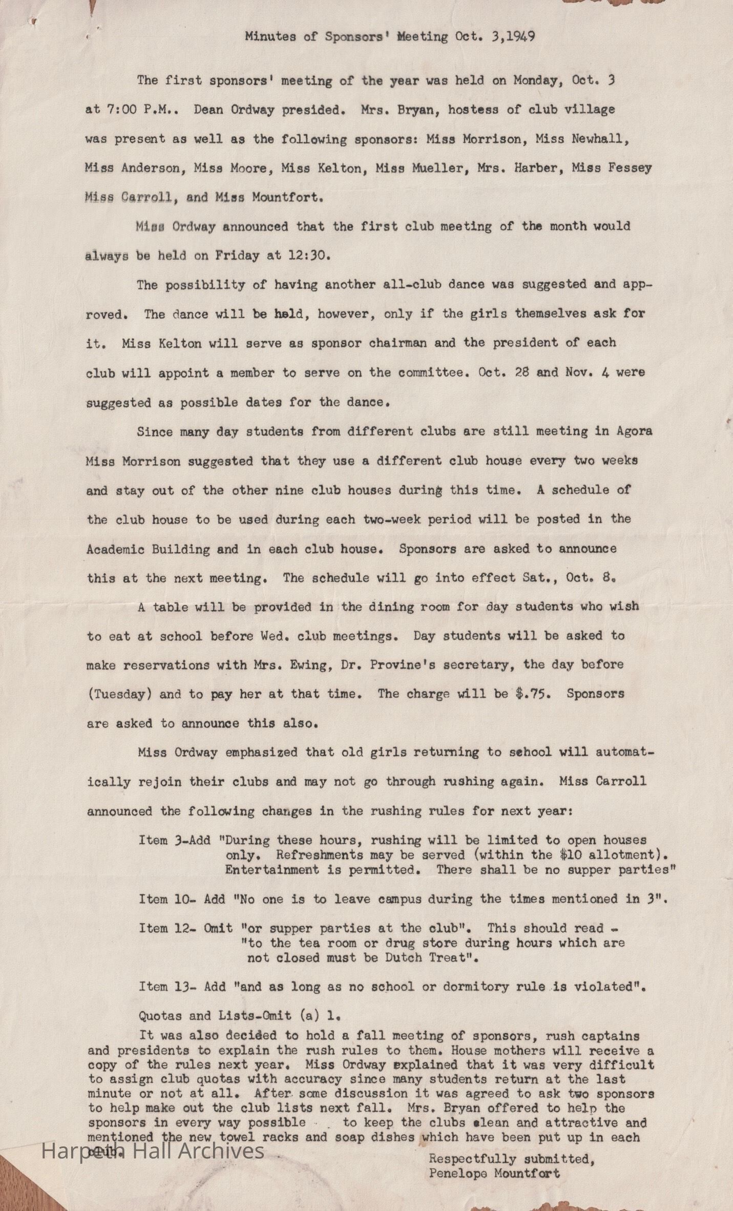 Meeting minutes from the club sponsors' meeting on October 3rd, 1949. They were submitted by Penelope Mountfort.Collection