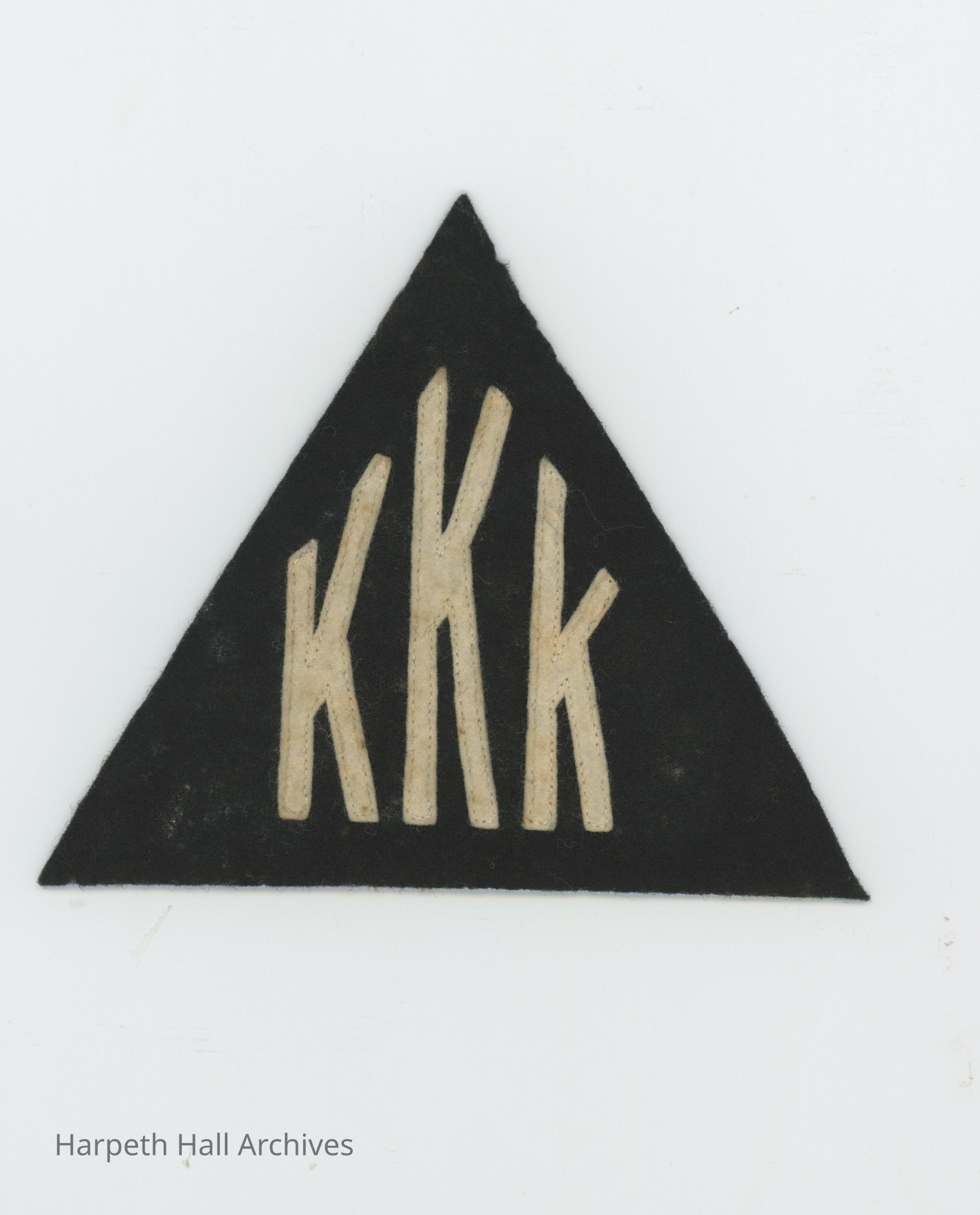 A triangular pennant for the Tri K social club at Ward-Belmont. Per the 1938 Ward-Belmont Hyphen, "the Tri K Club's name, Kubla Khan Klub, was taken from a wise old Mongolian ruler who was known for his good citizenship."Context