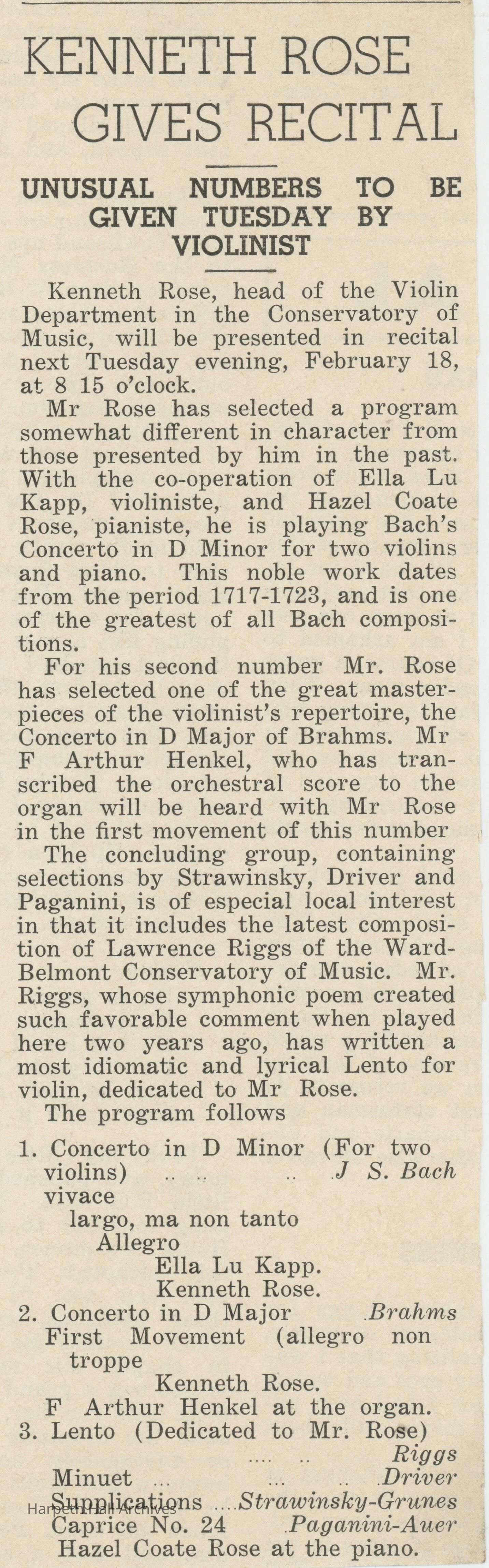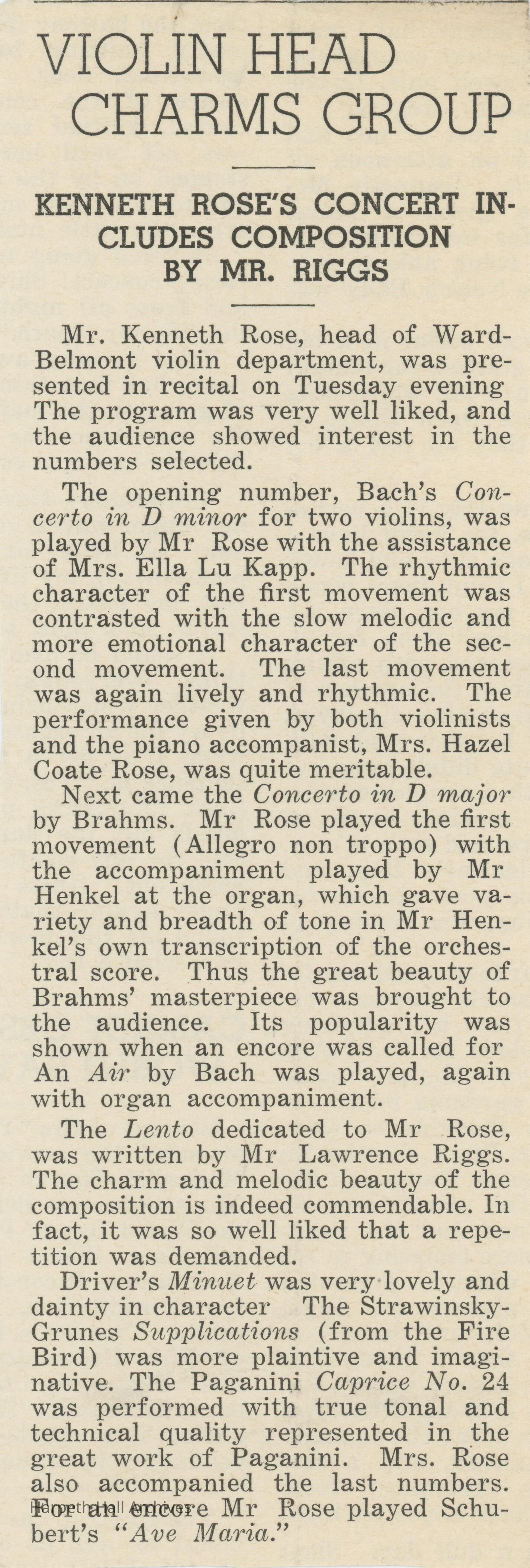 Two articles written about Kenneth Rose, the head of Ward-Belmont's violin department.Collection