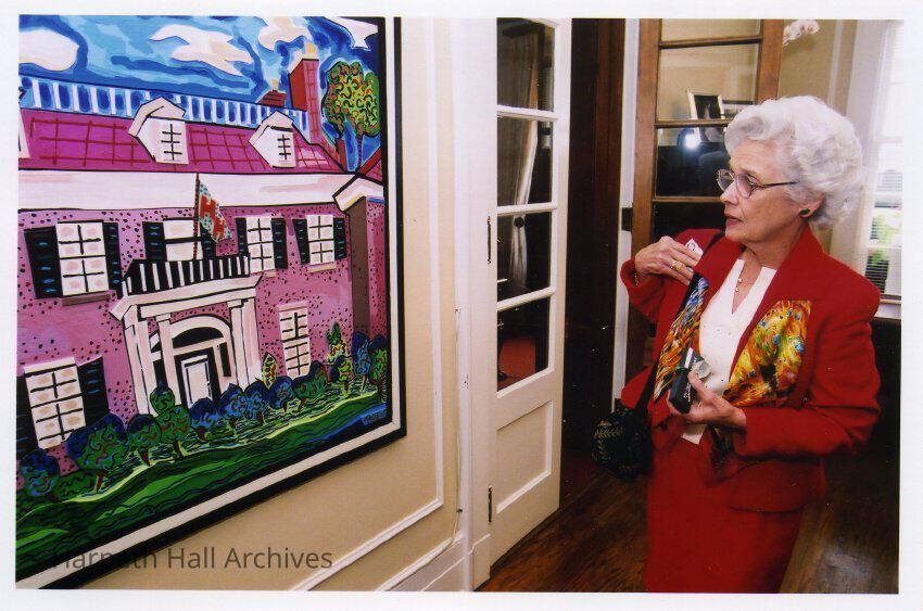 Corinne "Connie" Williams King (1947) looking at painting of Souby Hall at the Grand Alumnae Luncheon on May 4th, 2002 at the Harpeth Hall School