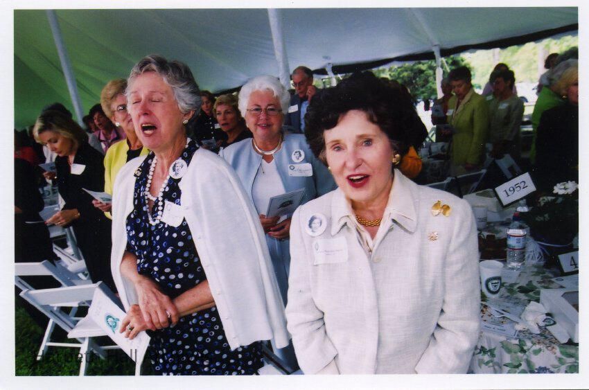 last on right is Madeline Reynolds Adams (1952) at the Grand Alumnae Luncheon on May 4th, 2002 behind Souby Hall at the Harpeth Hall School