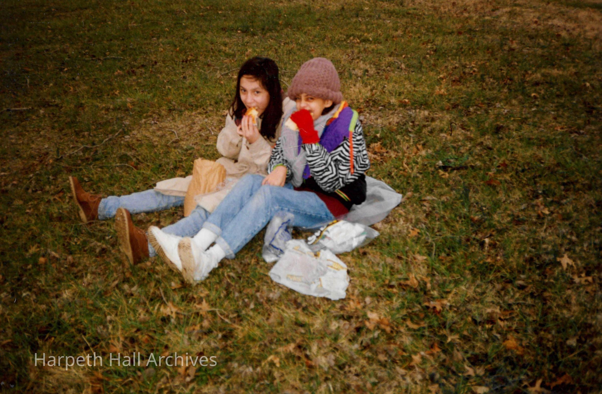 Two girls sitting on the grass and eating lunch while in fall or winter clothes.