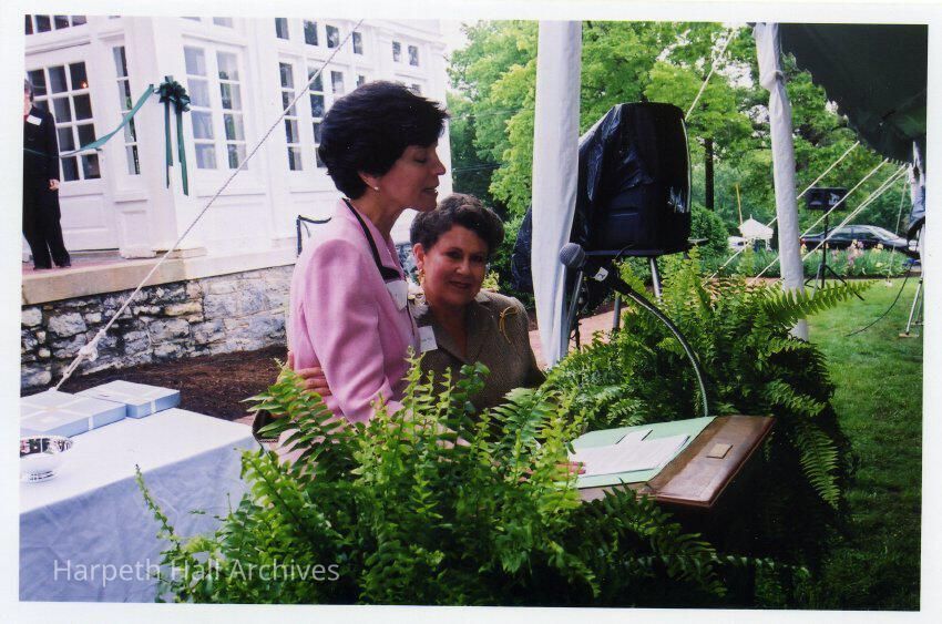 Ann Teaff (Head of School 1998-2014) with Mary "Polly" Jordan Nichols (1953) at the Grand Alumnae Luncheon on May 4th, 2002 behind Souby Hall at the Harpeth Hall School