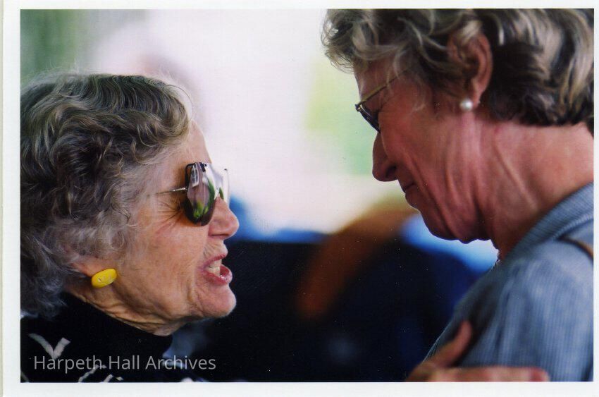 Grace Benedict Paine (1938) speaking with Leah Rhys (Head of School 1991-1998) at the Grand Alumnae Luncheon on May 4th, 2002 behind Souby Hall at the Harpeth Hall School