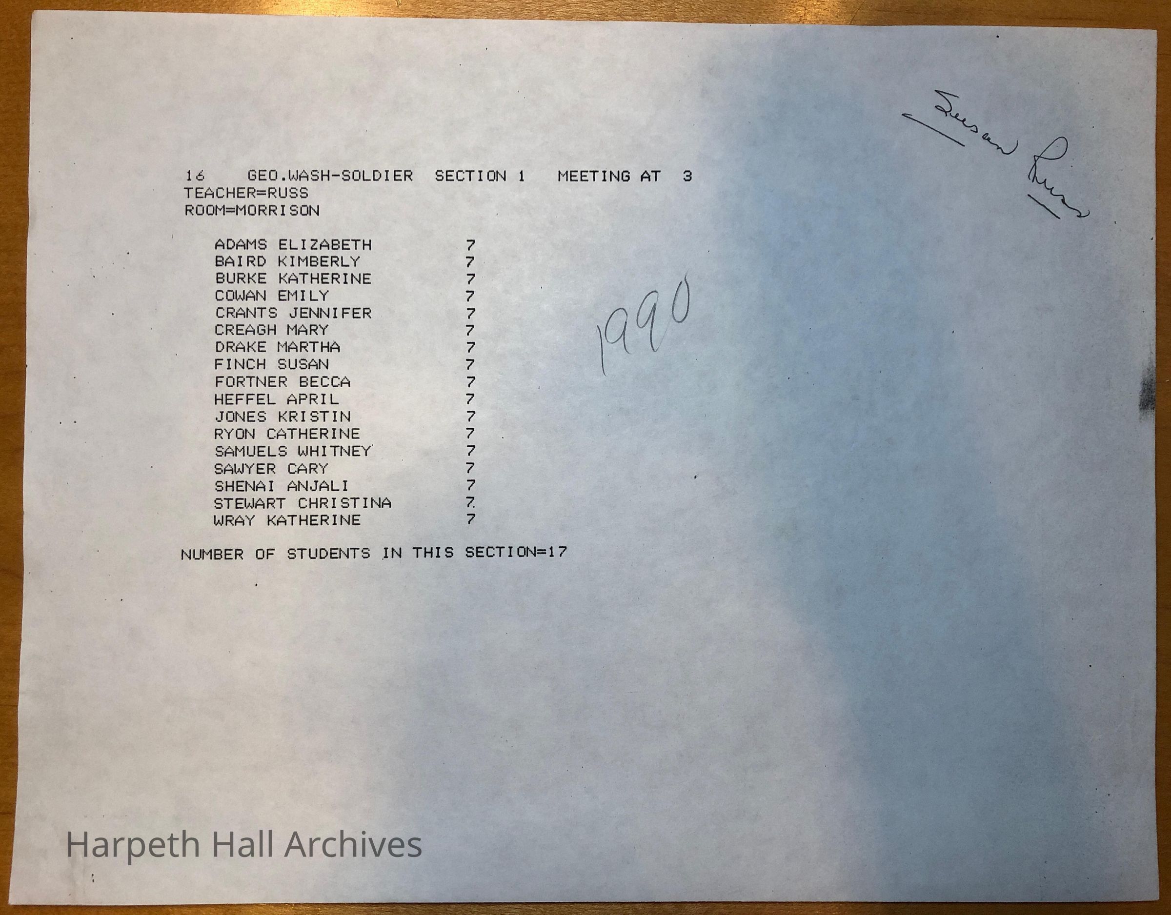 The list of soldiers for the George Washington Day Celebration in 1990 put on by the class of 1995 when they were in seventh grade.Context