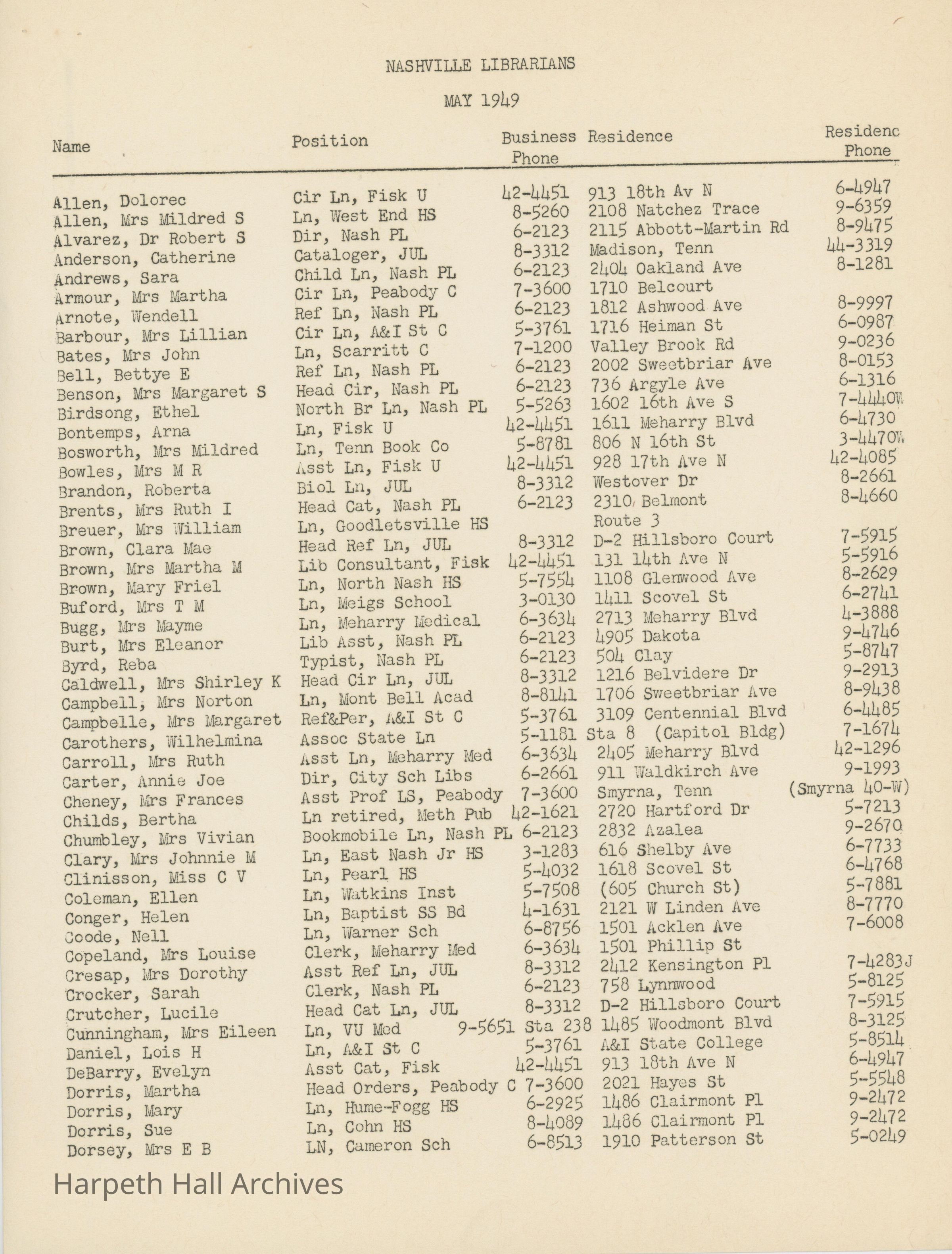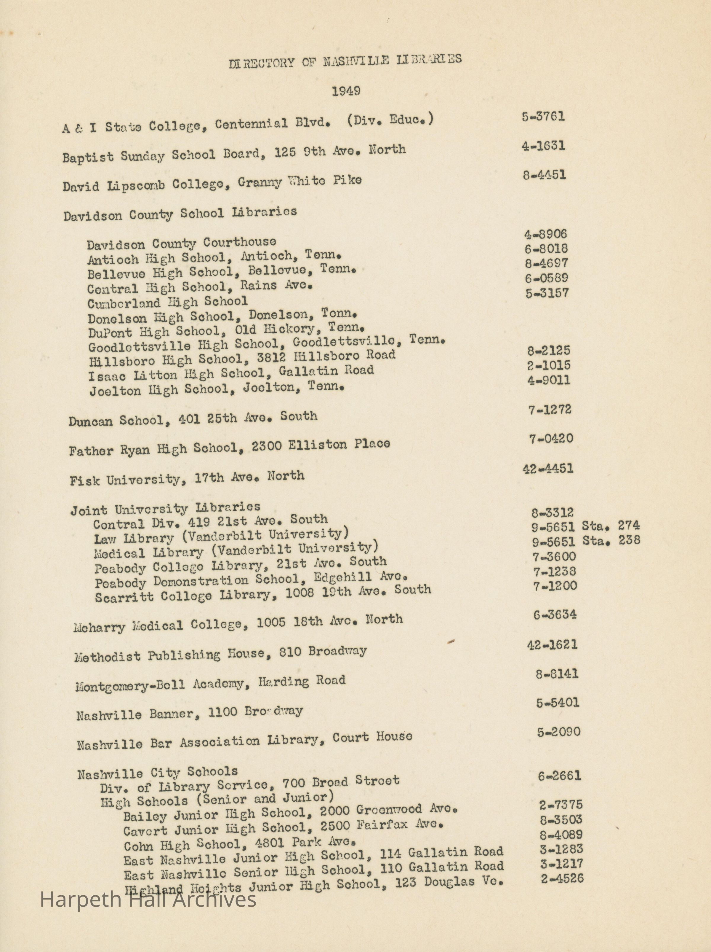 Directory of Libraries and Librarians of Nashville and Davidson County, May 1949Entry/Object ID