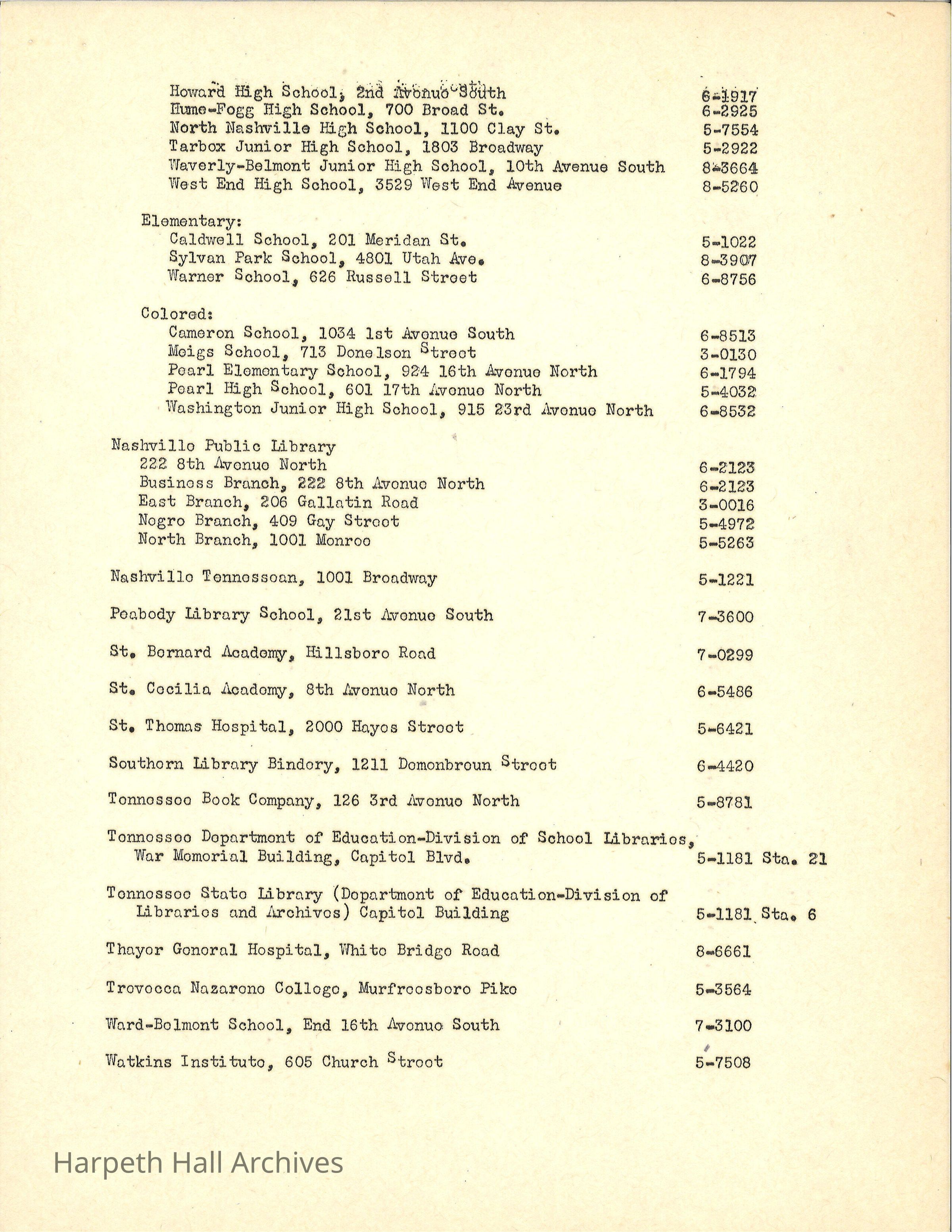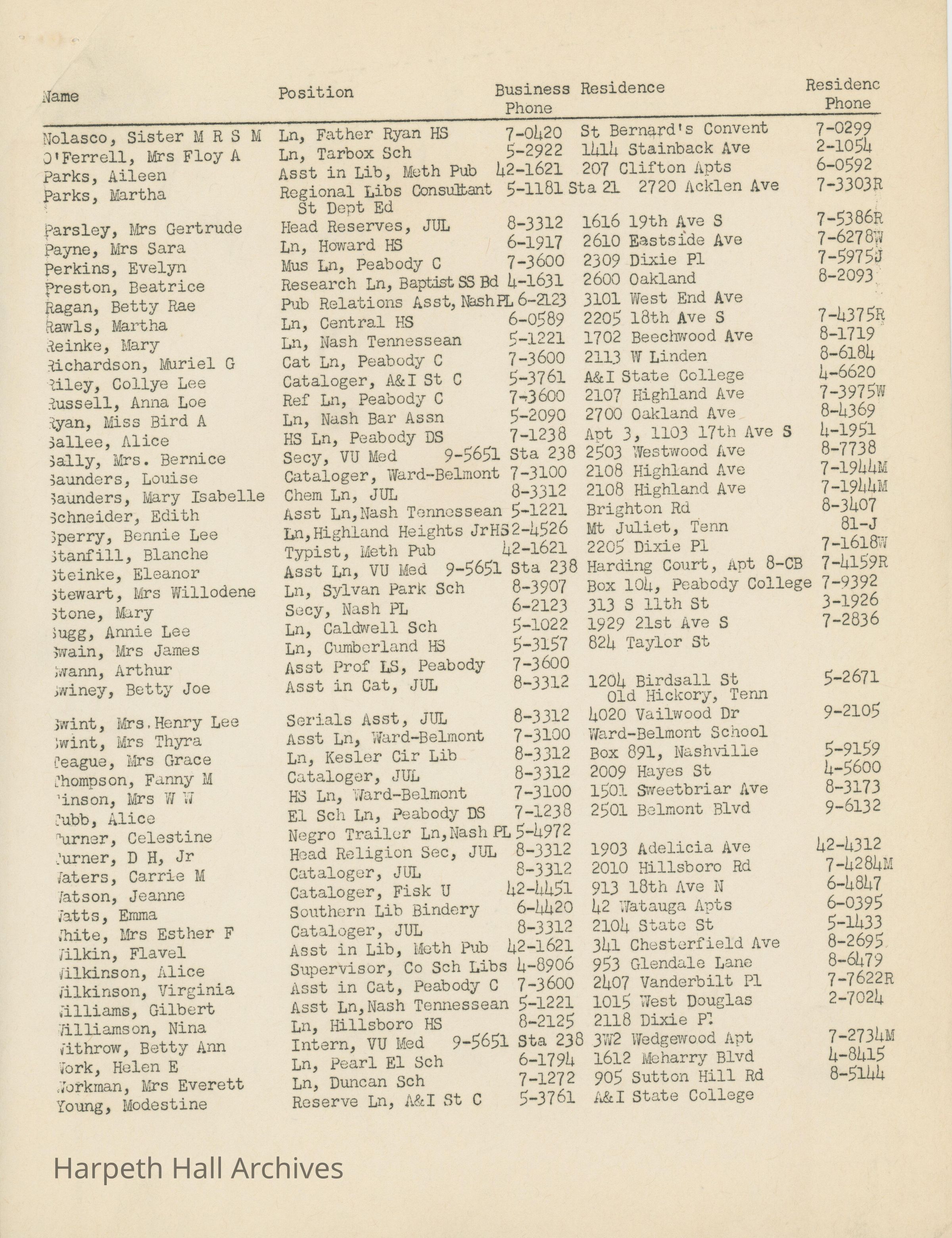 Ward-Belmont, Nashville, Directory, Library, Librarian, 1949, Nashville Library Club, Eleanor Steinke, J. H. Lancaster, Davidson County