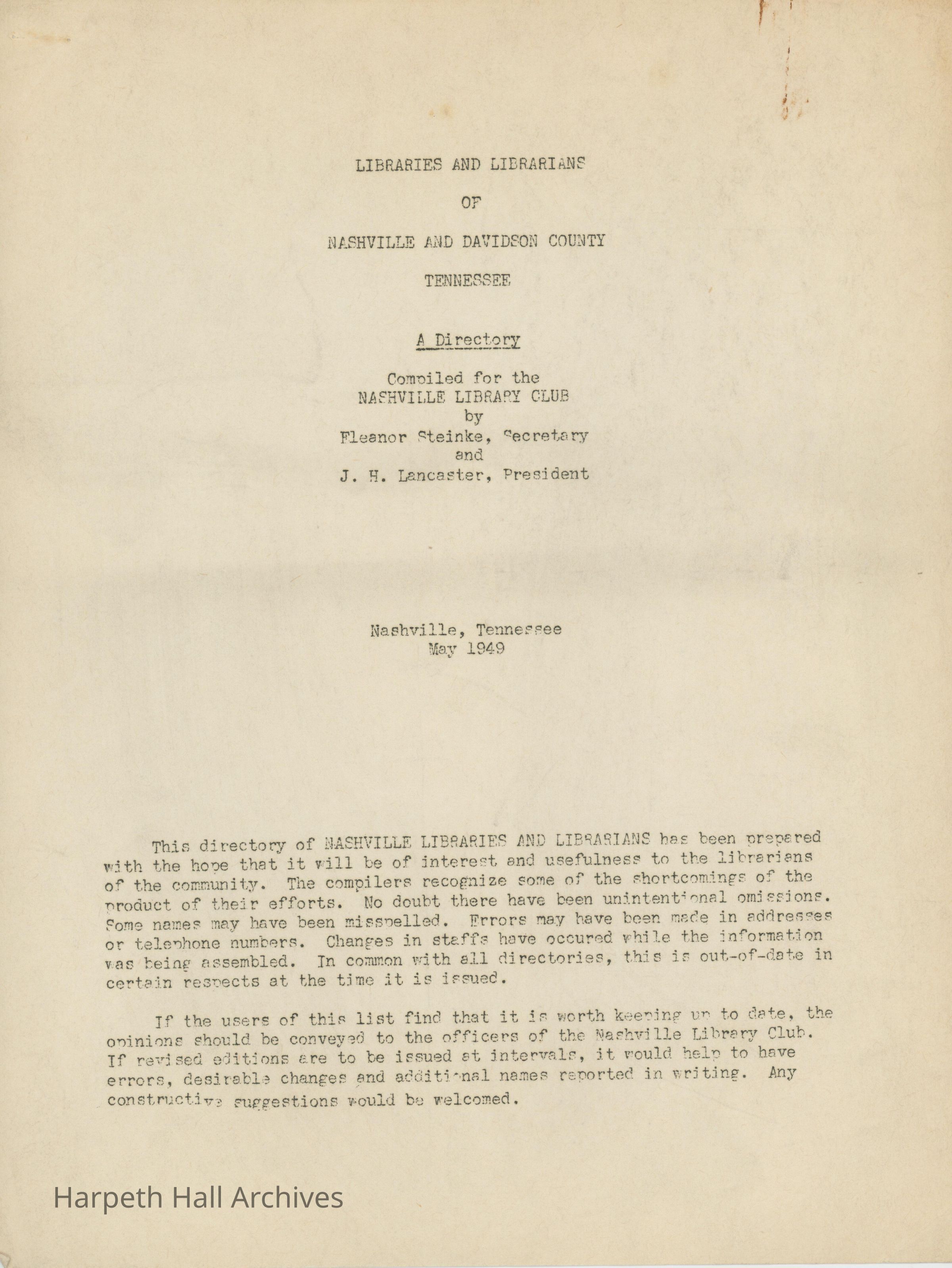 A directory of libraries and librarians in Nashville and Davidson County, Tennessee, compiled in May 1949 for the Nashville Library Club by Eleanor Steinke (secretary) and J. H. Lancaster (president).Context