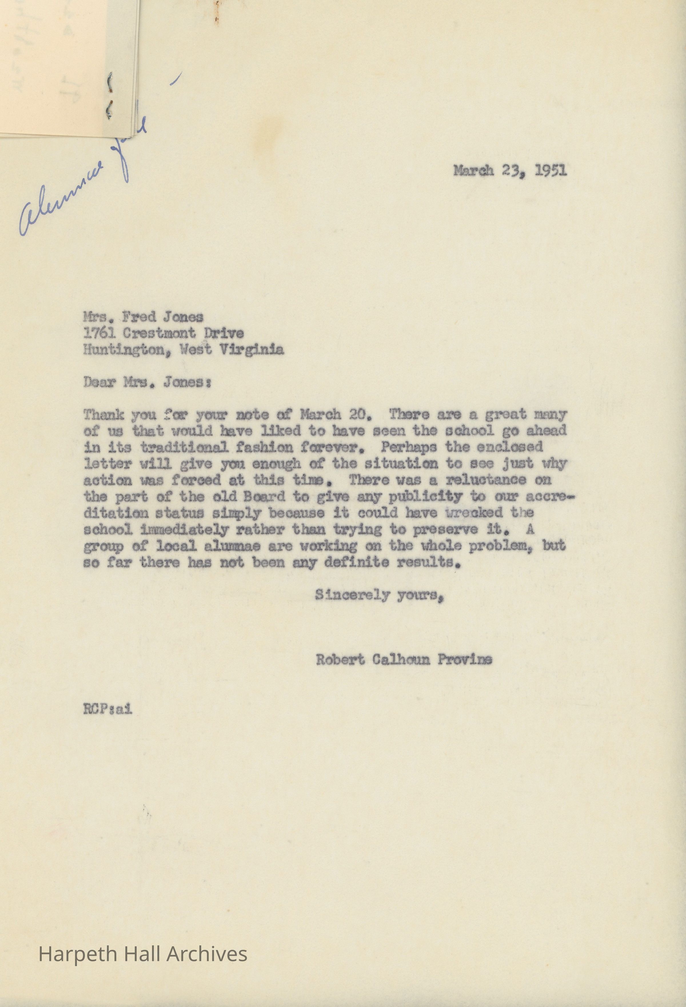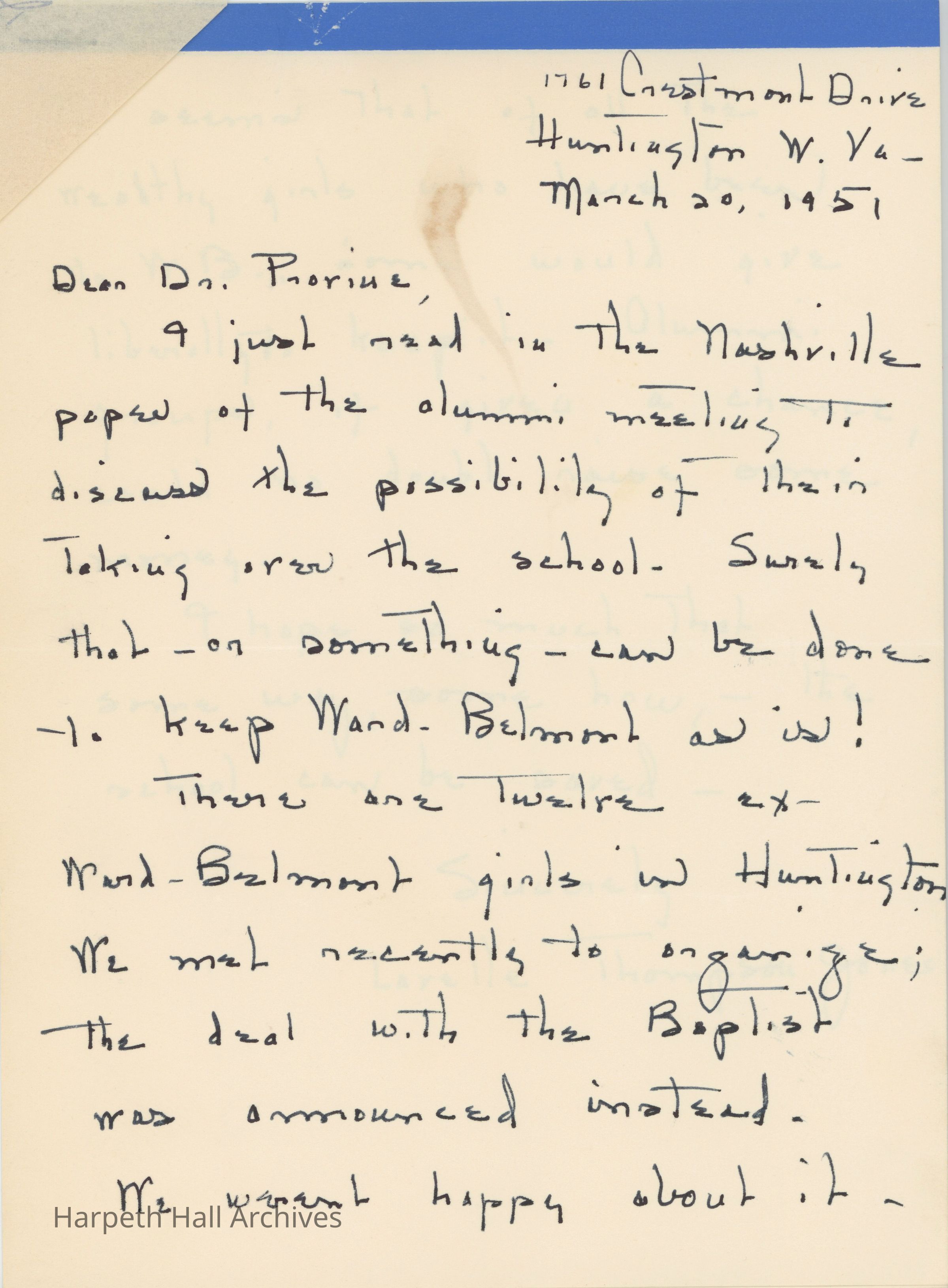 Mrs. Jones, a Ward-Belmont alumna living in Huntington, reveals in a letter that she and other WB Huntington residents were not pleased with the announcement that Ward-Belmont had been sold to the Baptists. They hope that the school can be saved somehow, and Robert Provine responds explaining why the WB Board took the measures they did.Collection
