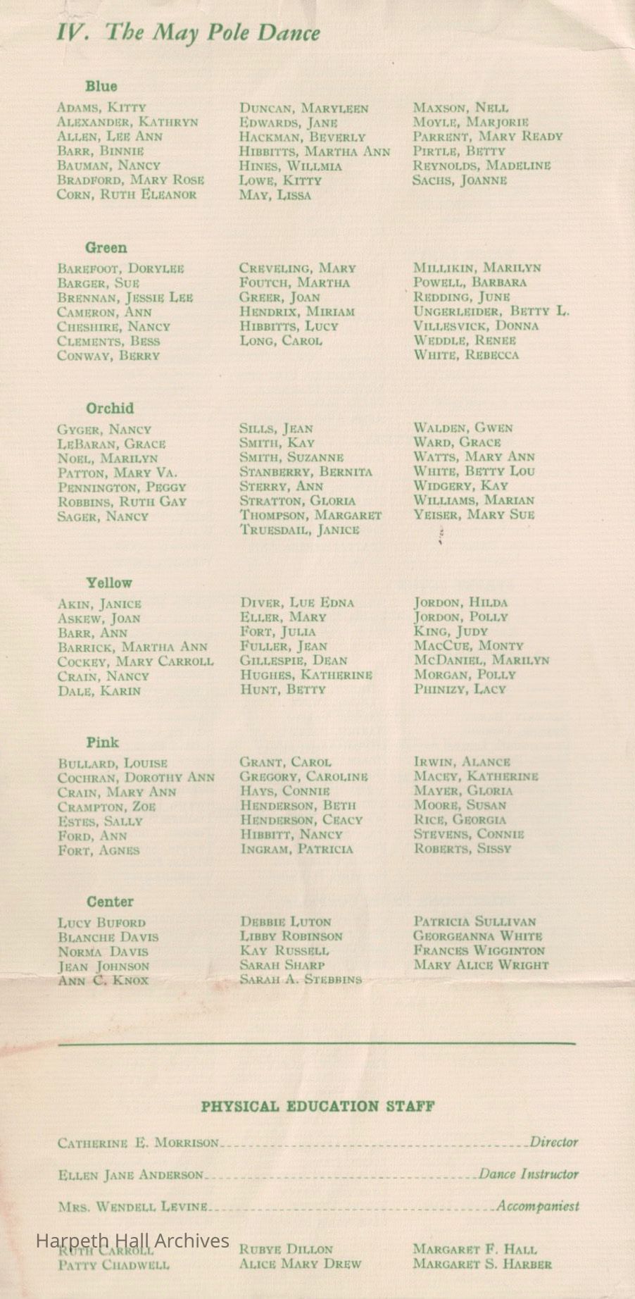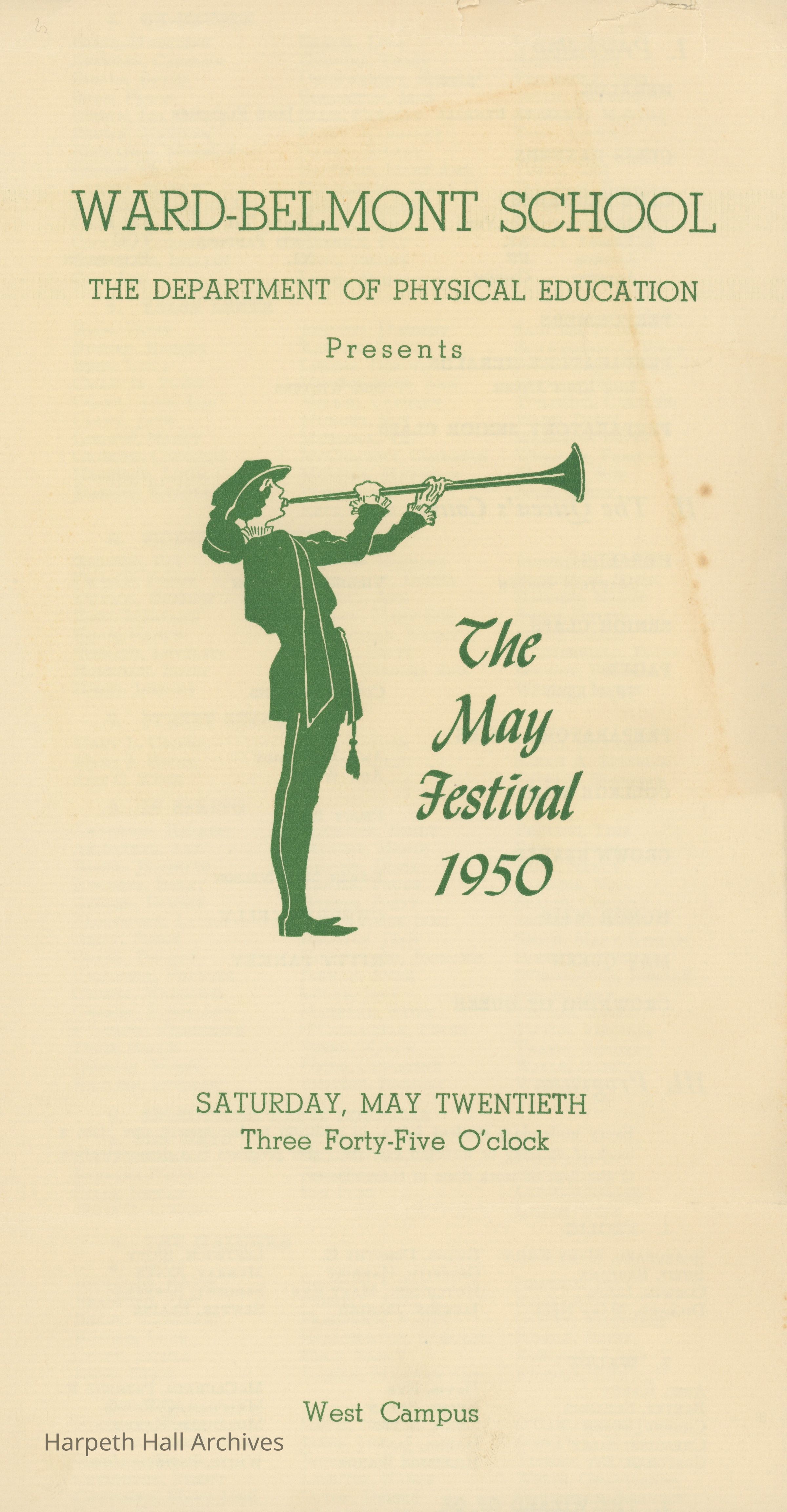 A program for the 1950 Ward-Belmont May Festival, presented by the Department of Physical Education. Held on the West Campus on Saturday, May 20, 1950, at 3:45 P.M. The program consisted of four parts: a procession, the presentation of the May Queen and her court, the Program itself (involving several dances and a gymnastics demonstration), and the May Pole dance. The 1950 May Queen was Kitty Pankey.Context