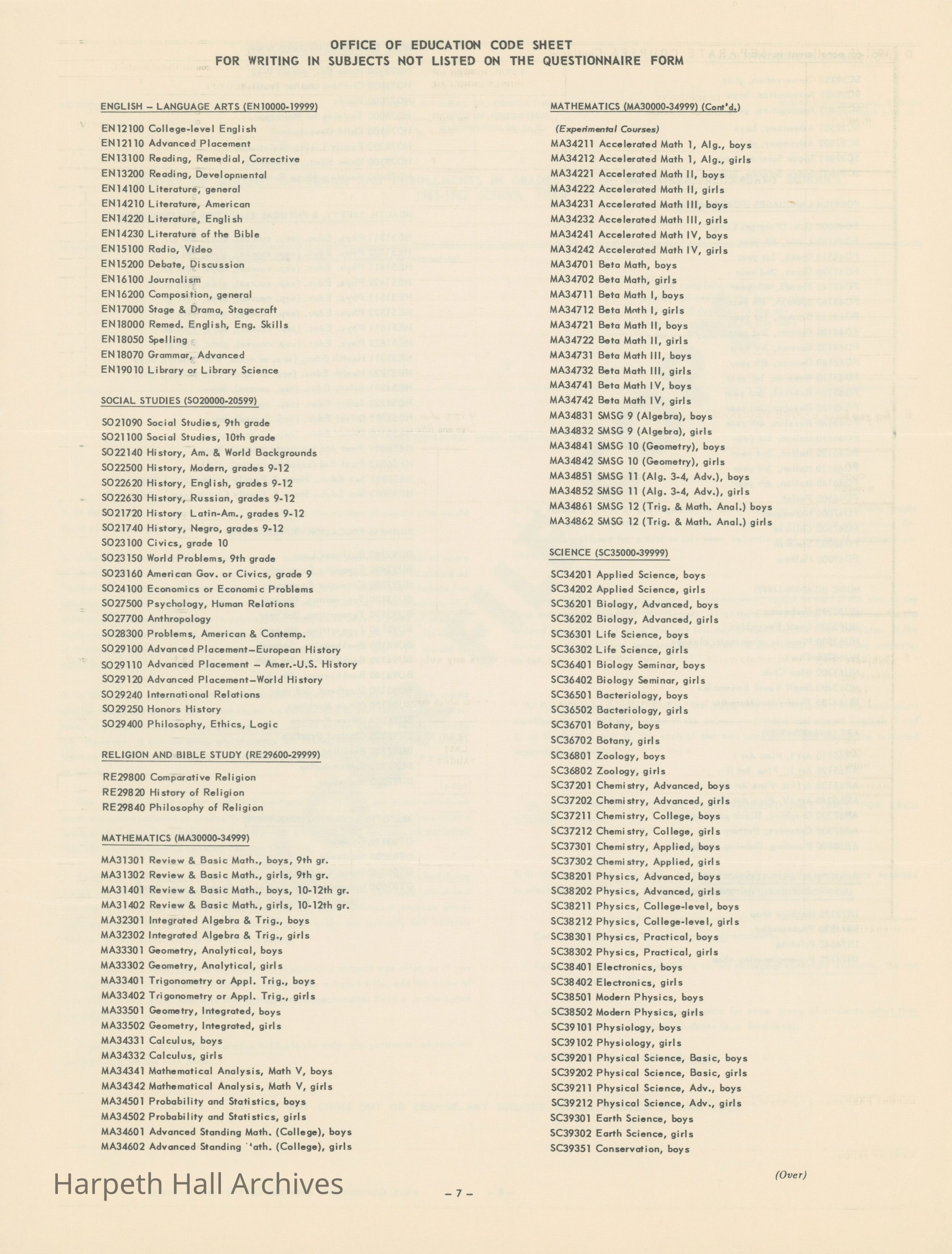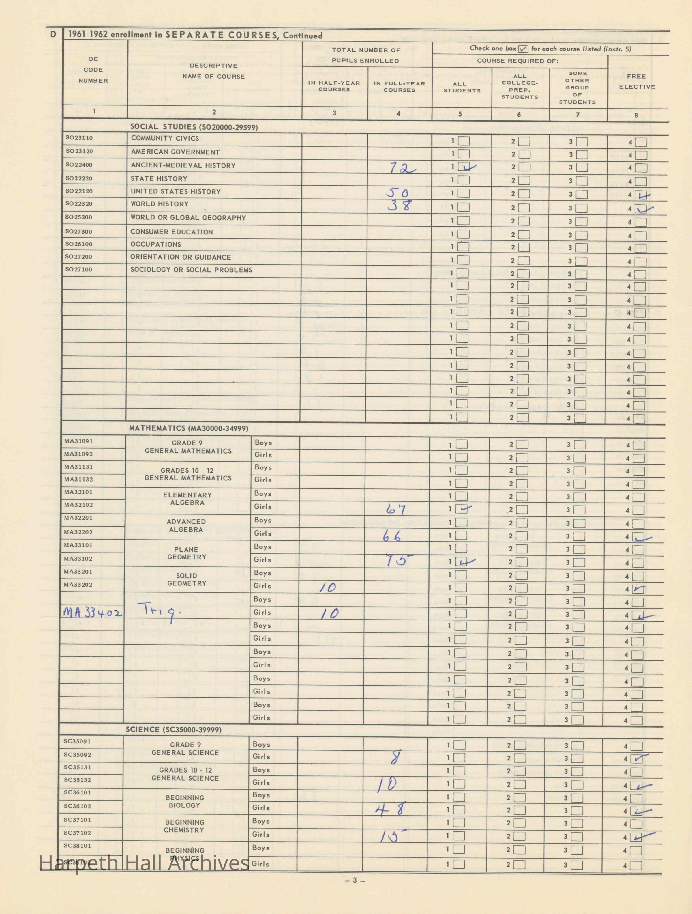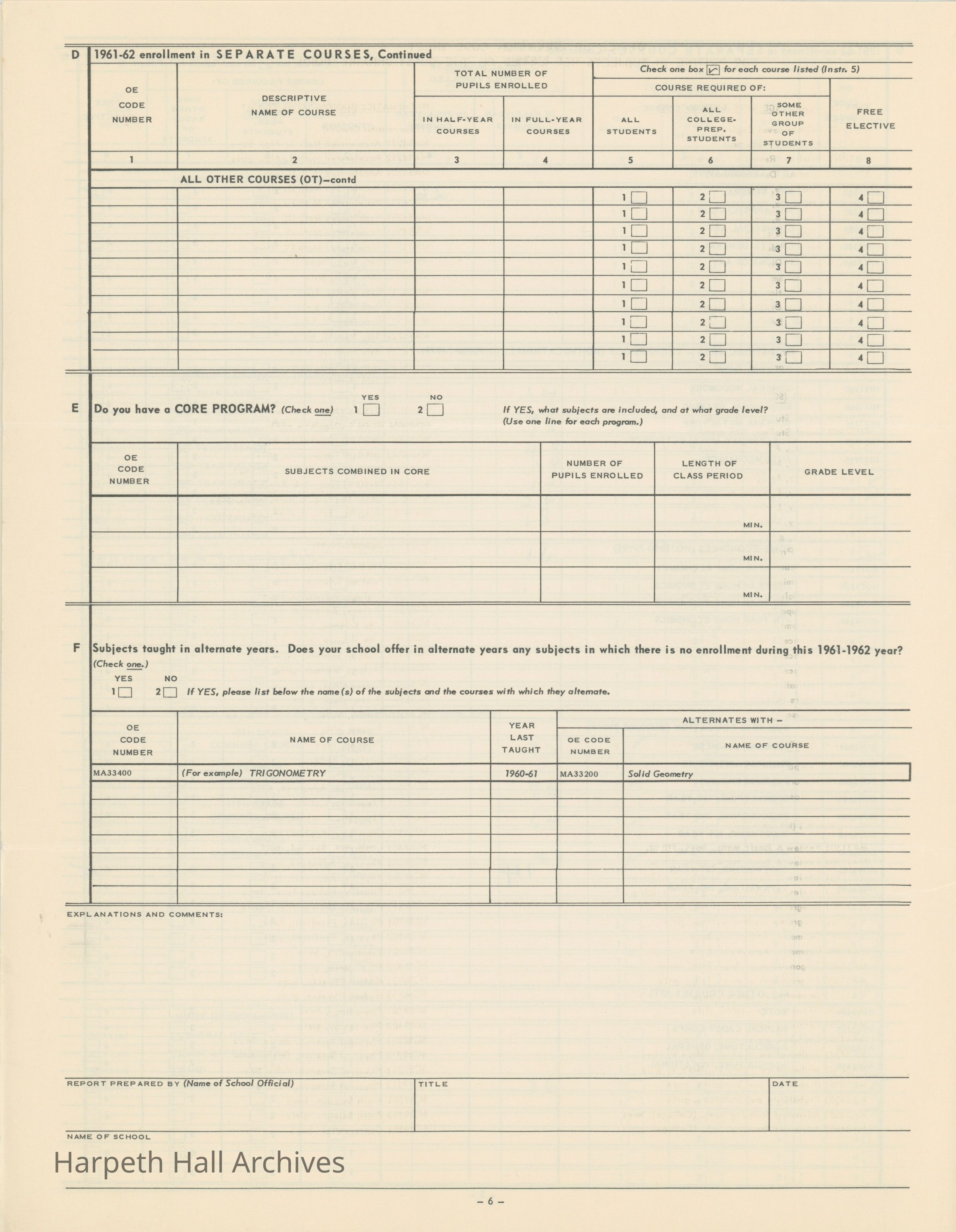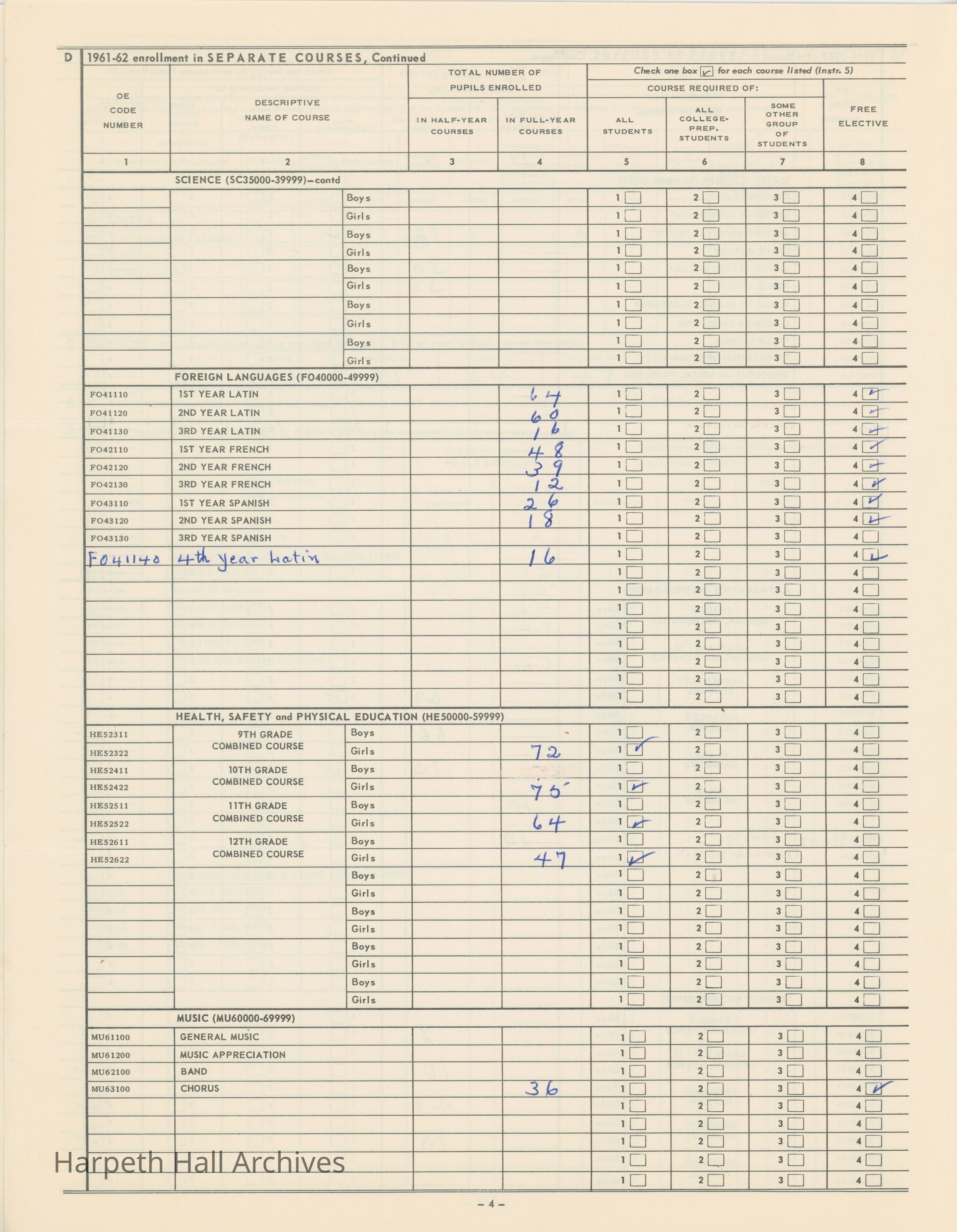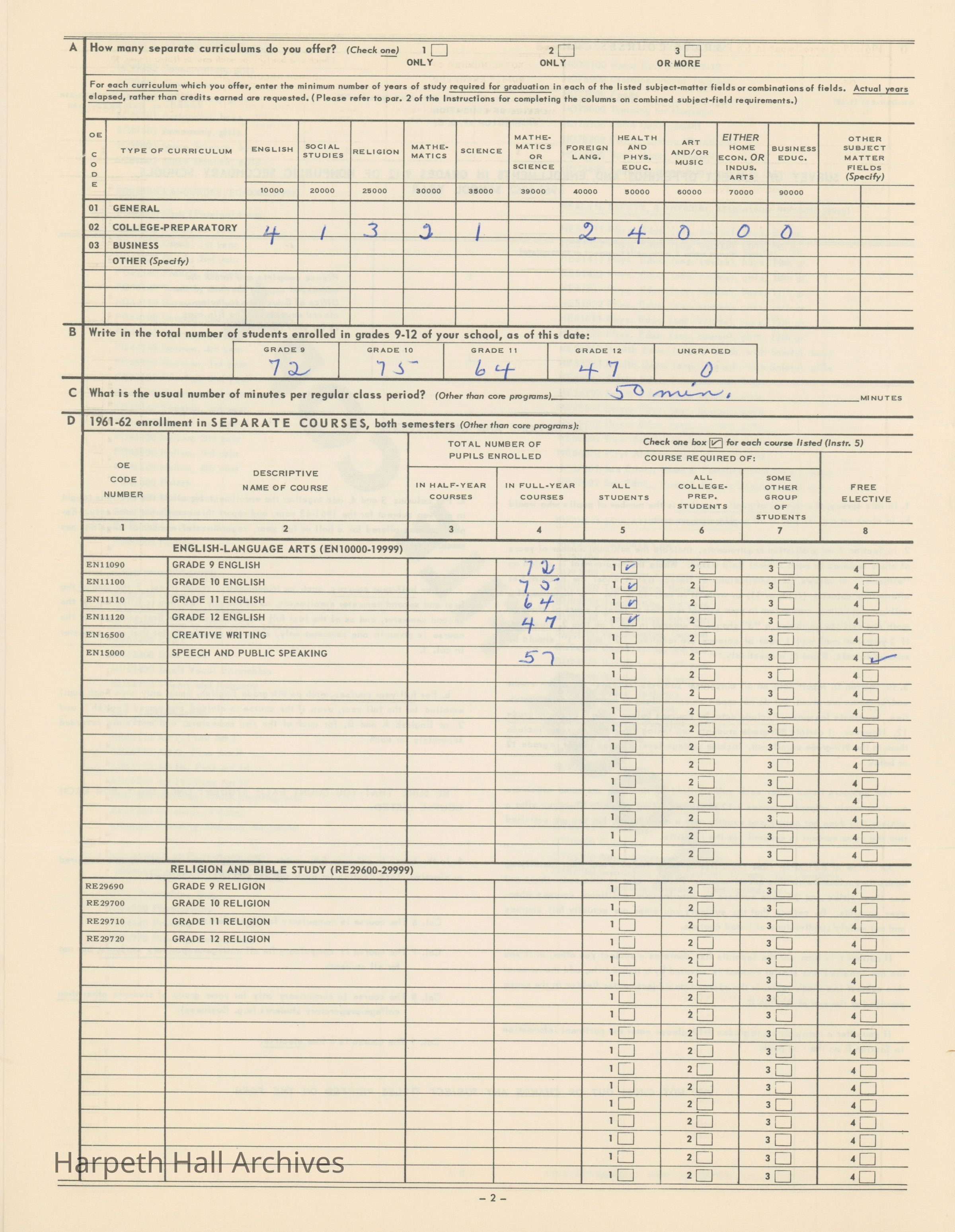 Questionnaire on Harpeth Hall's offerings for the 1961-62 school year.Collection