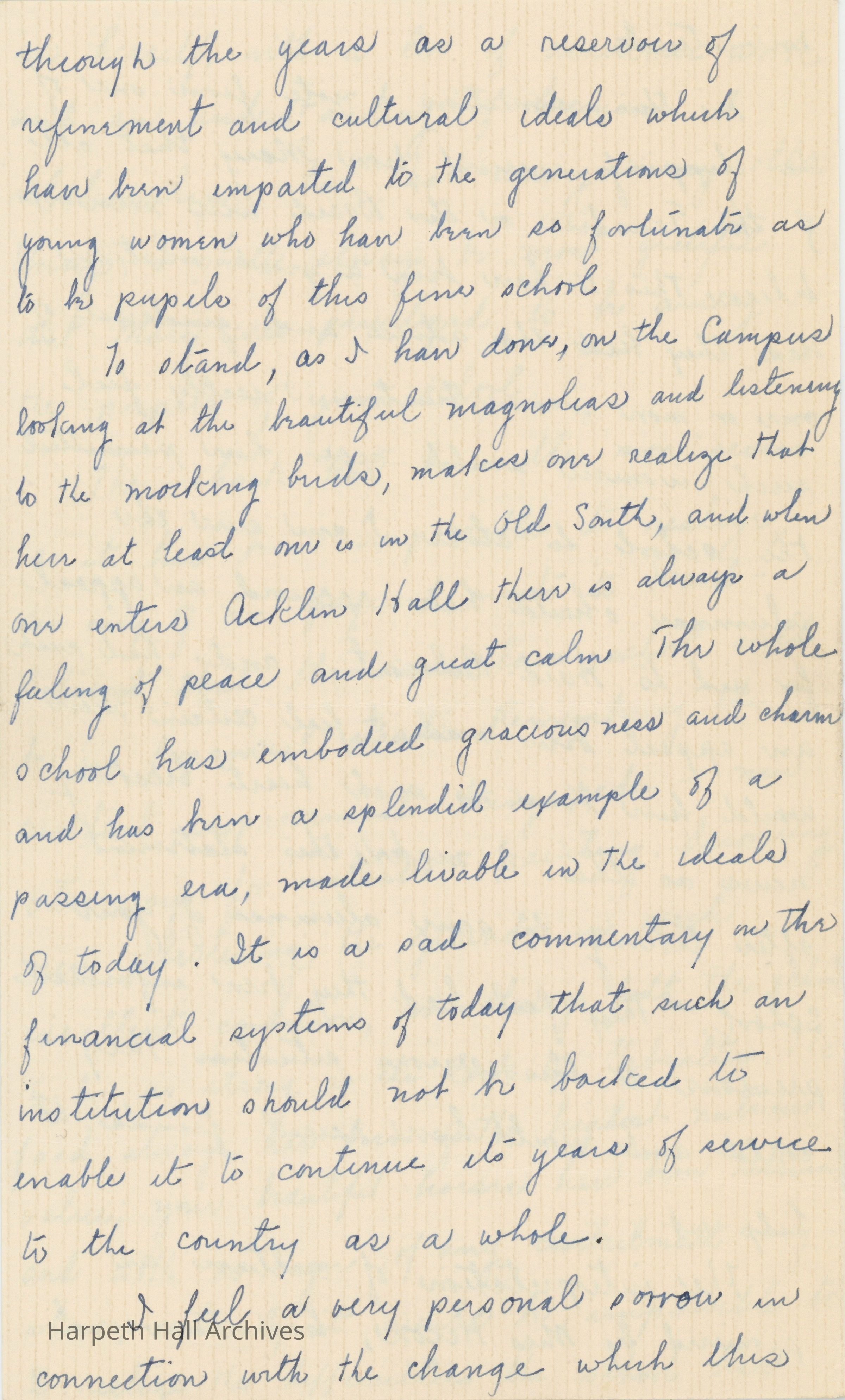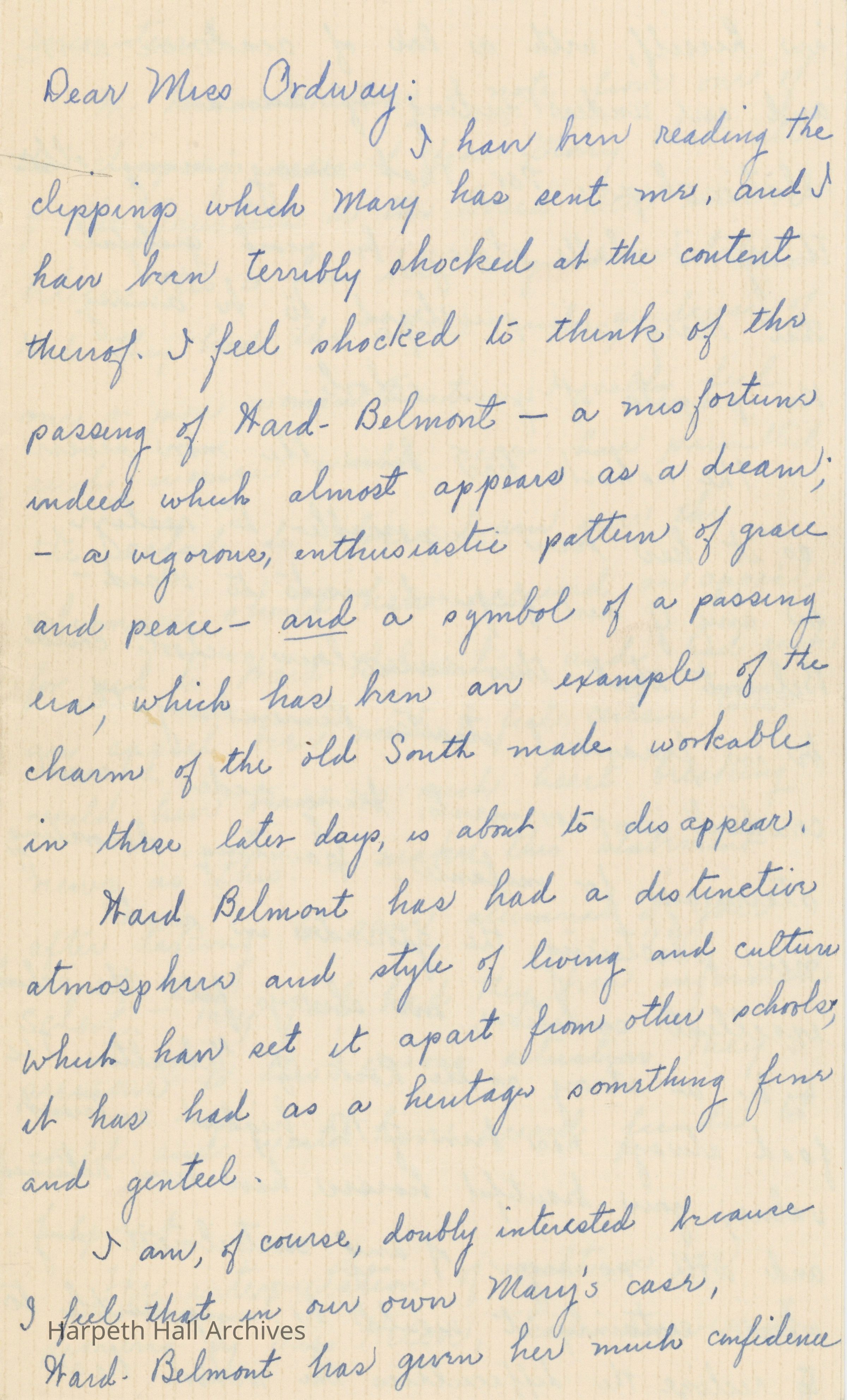 Letter from a WB alumna reacting to the news of Ward-Belmont's new ownership. She is saddened by the culture change that will likely occur under the Baptists' direction and hates to see the Ward-Belmont she knows come to an abrupt and unjust end.