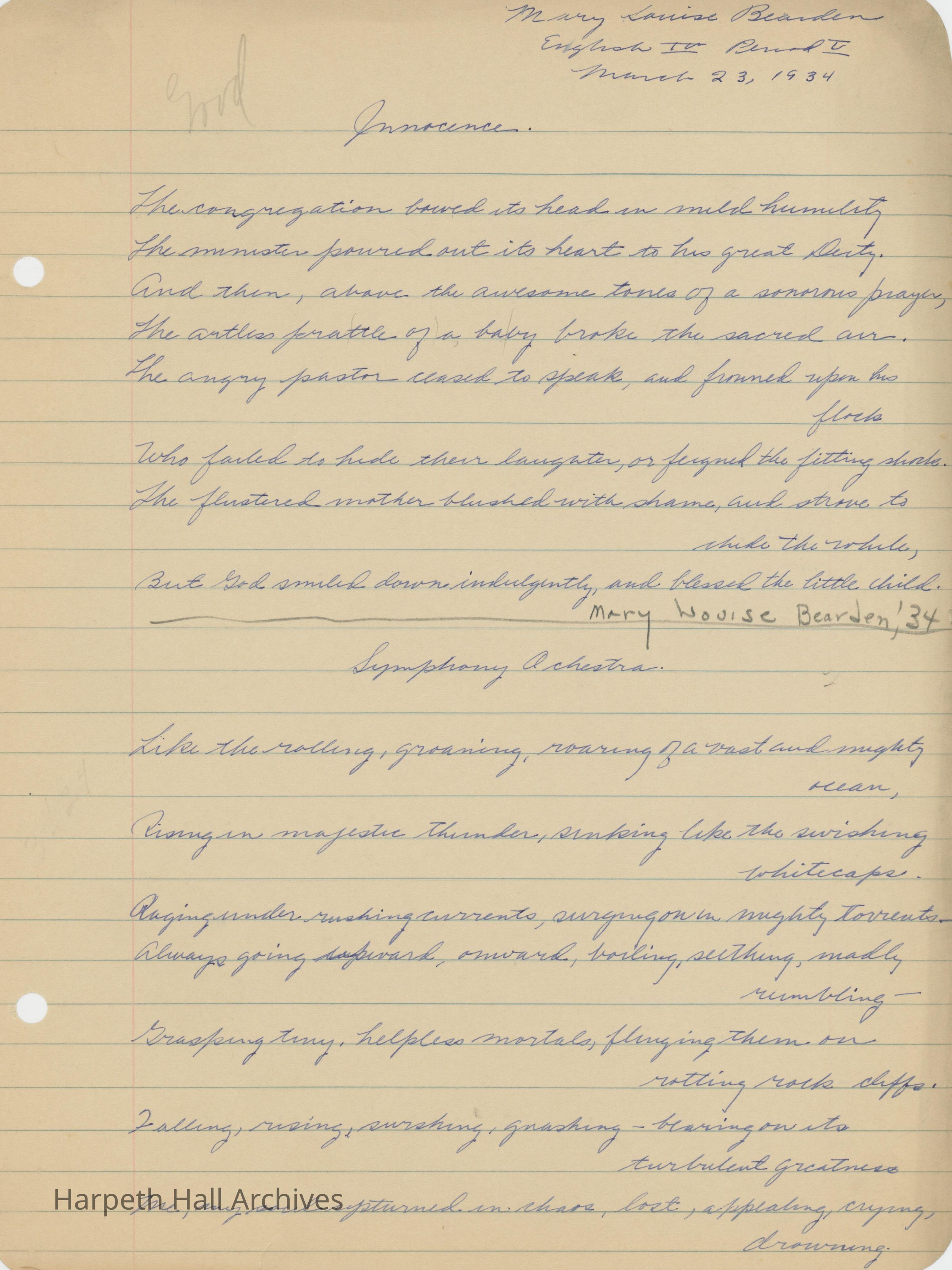 Poetry written by Ward-Belmont student Mary Louise Bearden on March 23rd, 1934. The poems are titled, "Innocence" and "Symphony Orchestra."Collection