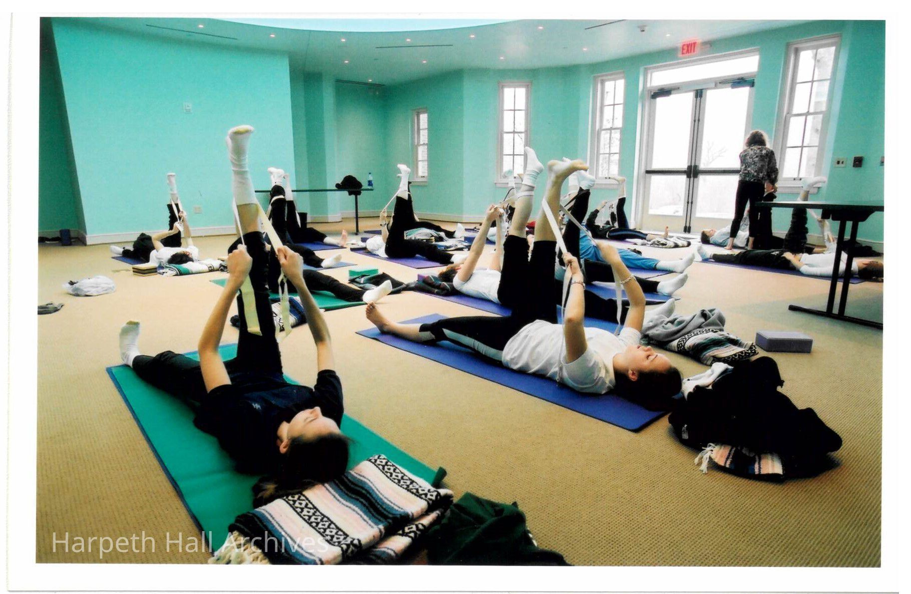 A photograph of Harpeth Hall students practicing yoga in the Harpeth Hall library during a Winterim class sometime in the 2000s. Per the 2000-2006 Winterim course catalogs, several courses were offered that provided students the opportunity to learn yoga: "Kick It Up!" introduced students "to all the latest in fitness training -- Tae-Bo, kickboxing, body sculpting, yoga, step, and lots more. Throughout the course, you will have the opportunity to experience the fundamentals of aerobic and anaerobic training." "Body Talk" was specifically a yoga class, which was later renamed to simply "Yoga."