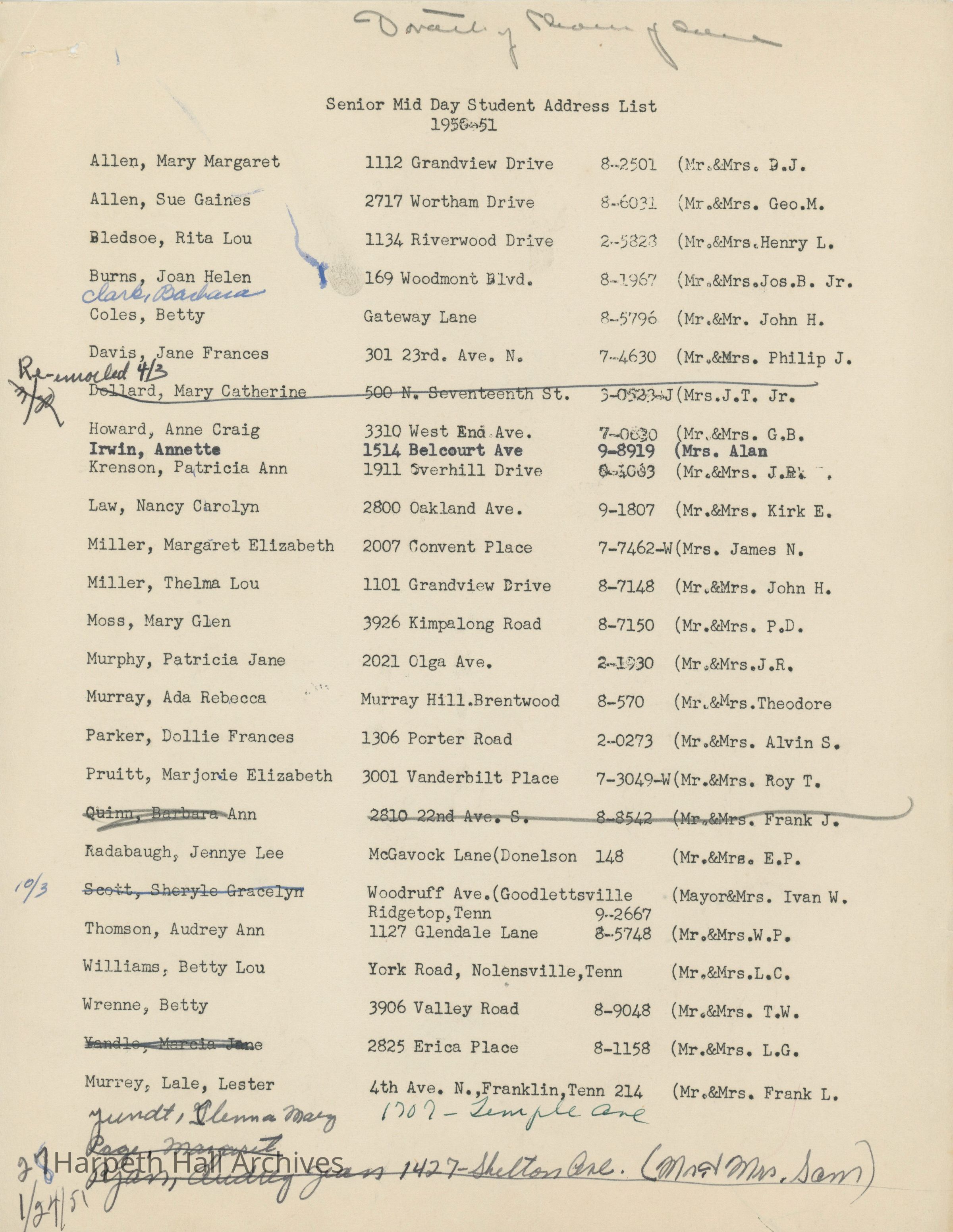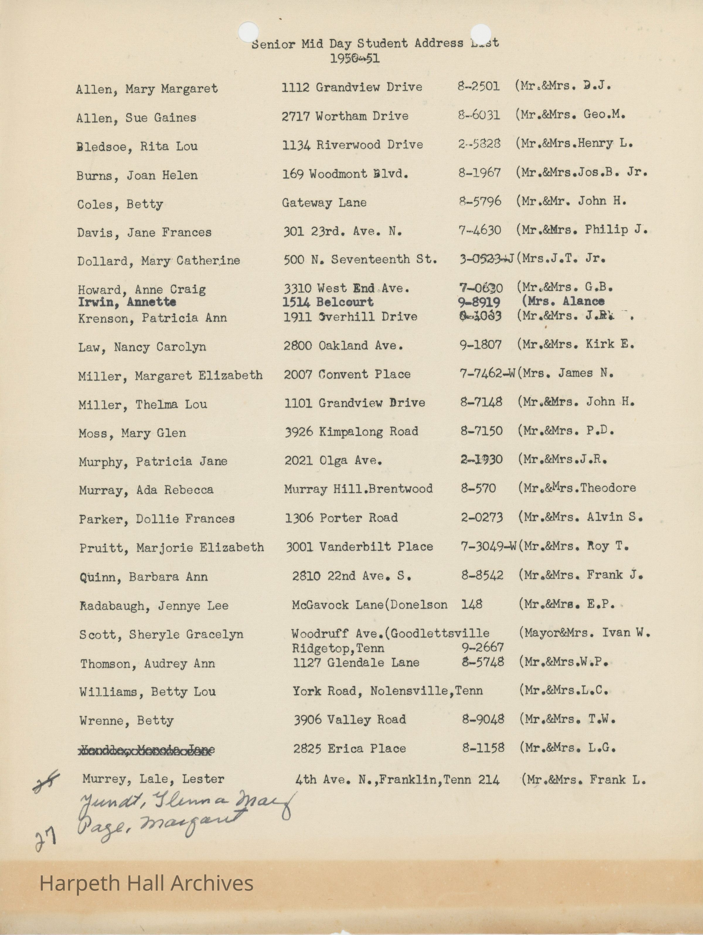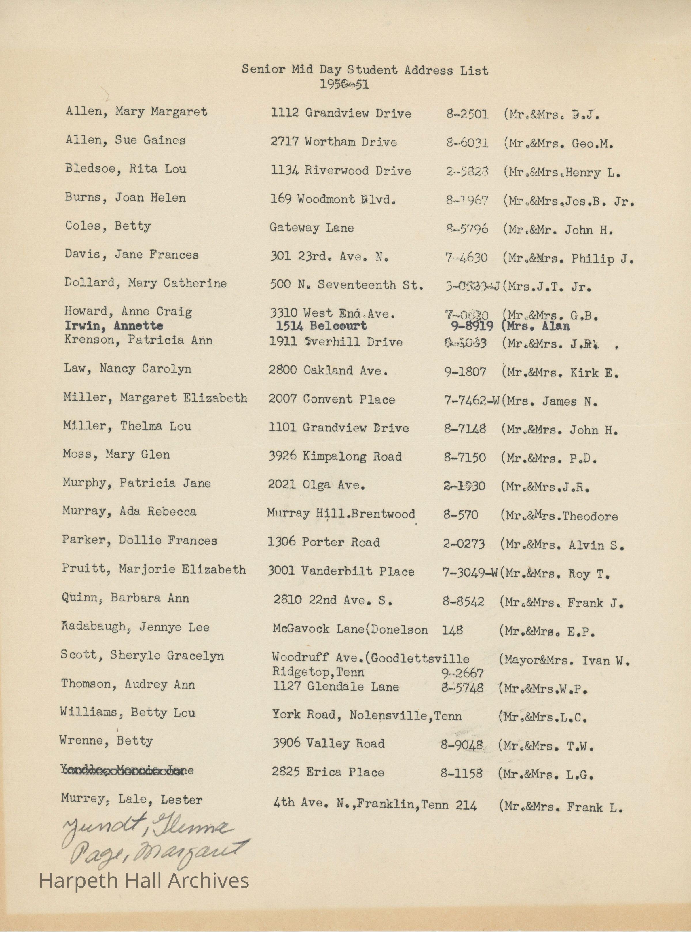 Senior Mid Day Student Address List, 1950-51