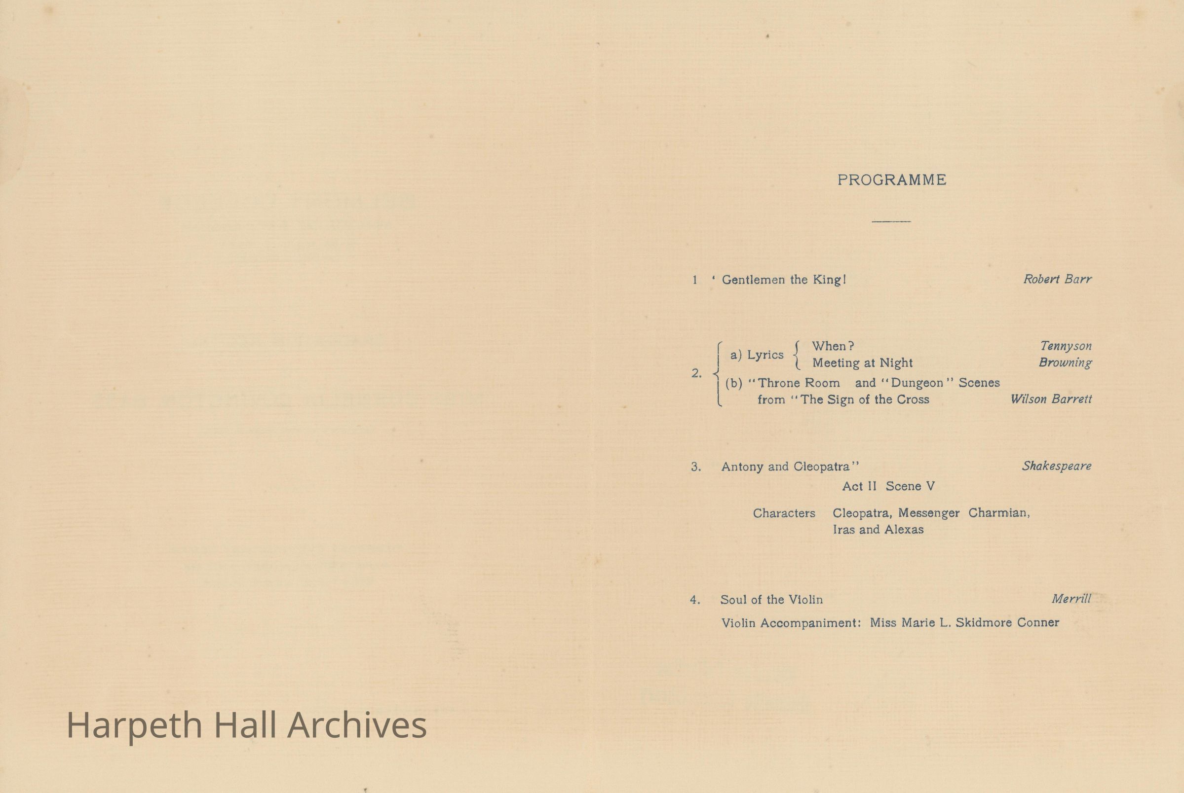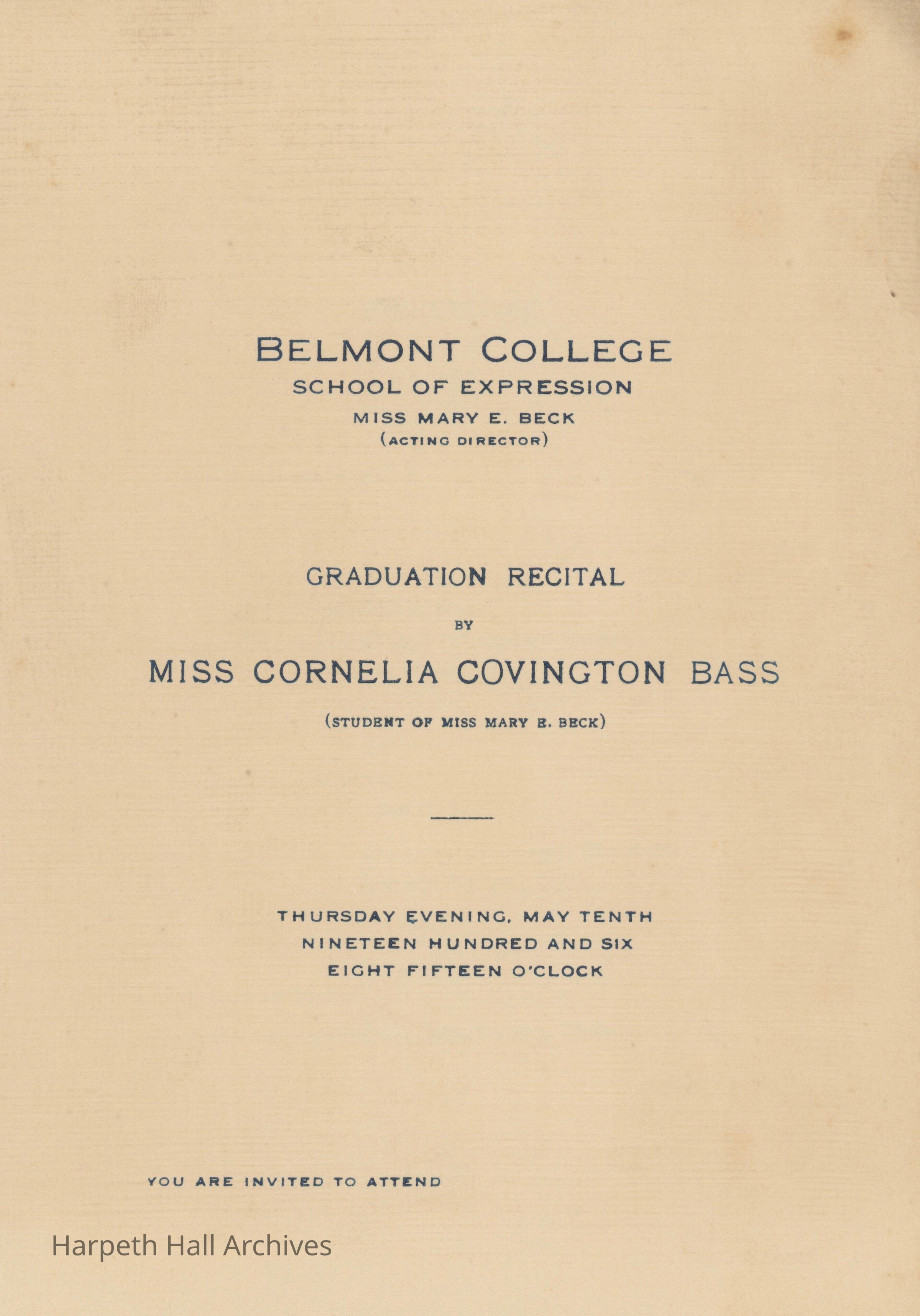 A program for the graduation recital of Cornelia Covington Bass on May 10, 1906. She was a student of the acting director, Mary E. Beck at Belmont College School of Expression. Her Performances include songs, excerpts from plays including Shakespeare’s Antony and Cleopatra. For “Soul of the Violin” she was accompanied by Marie L. Skidmore Conner playing the violin.Collection