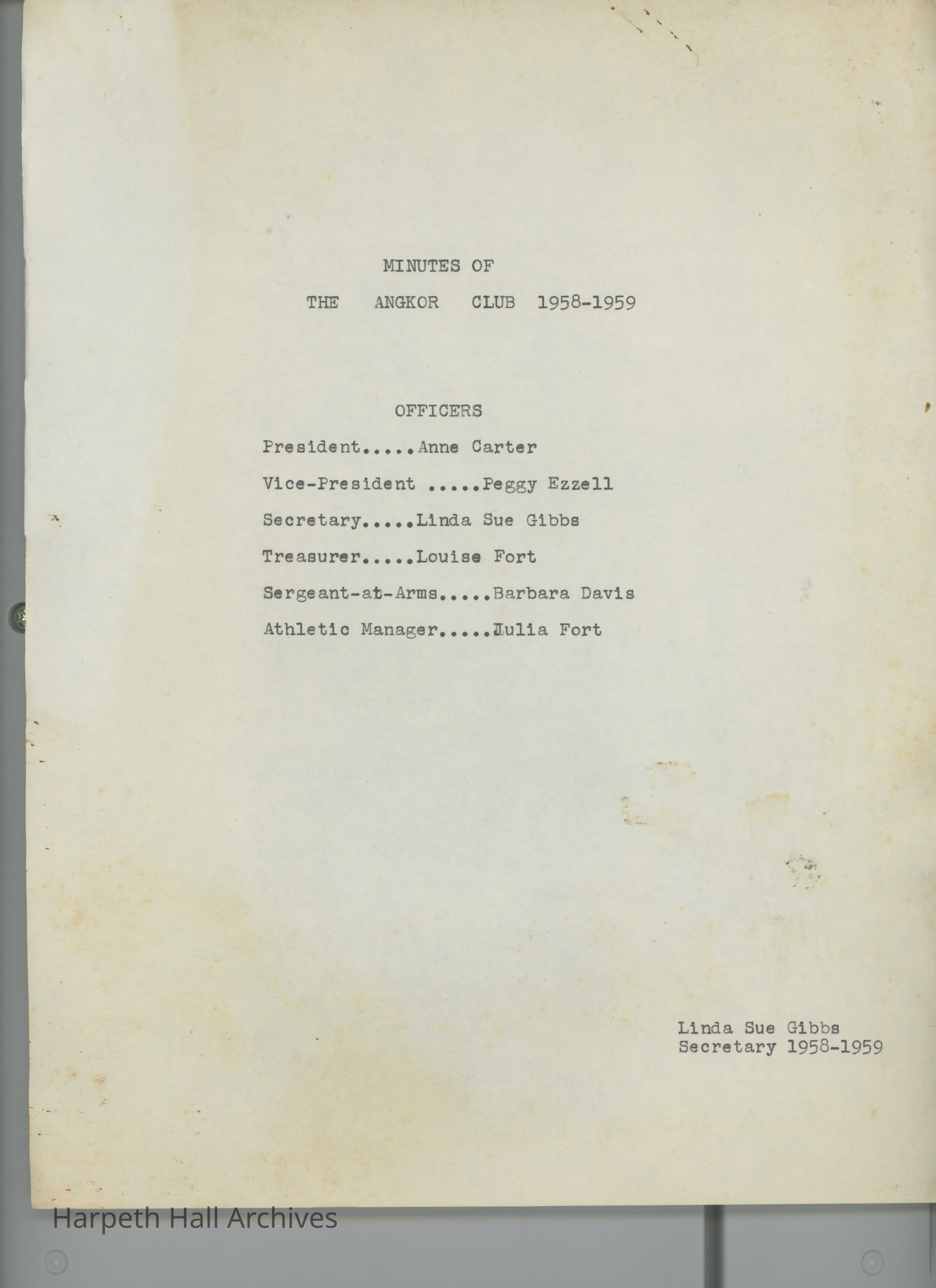 Minutes from club meetings during the 1958-1959 schoool year describe activities and events of the club. The Angkor club is one of Harpeth Hall's four spirit clubs.