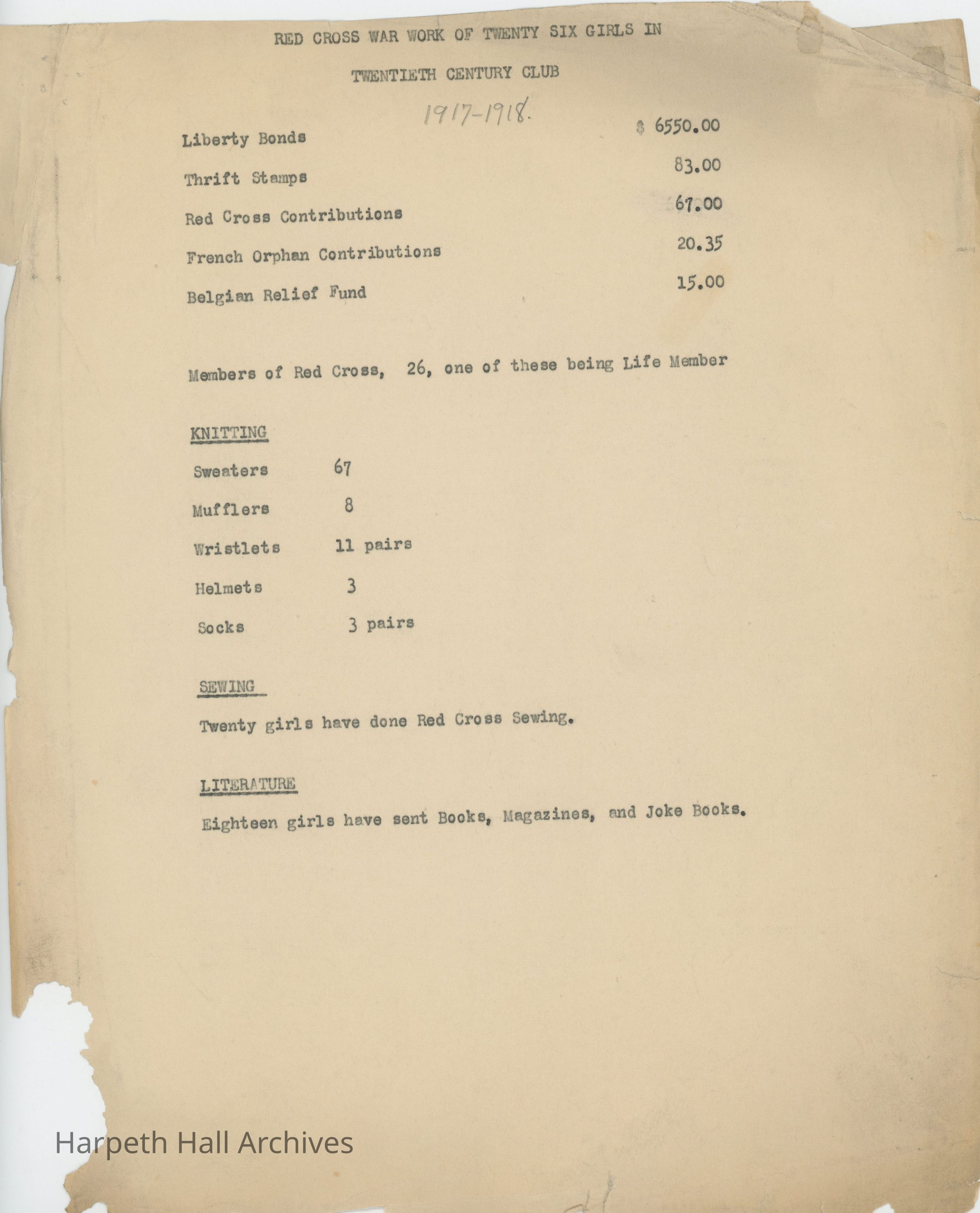 Two documents detailing the Red Cross work of members of the Ward-Belmont Twentieth Century Club during World War I. From 1917 to 1918, twenty-six students participated in fundraising through the buying of liberty bonds and thrift stamps and made monetary contributions to the Red Cross, Belgian Relief Fund, and French orphan organizations. All twenty-six students were members of the Red Cross, with one being a life member. A total of over 90 items were knitted, with twenty girls also participating in sewing for the Red Cross, and eighteen sending literature (books, magazines, and joke books) to soldiers.
