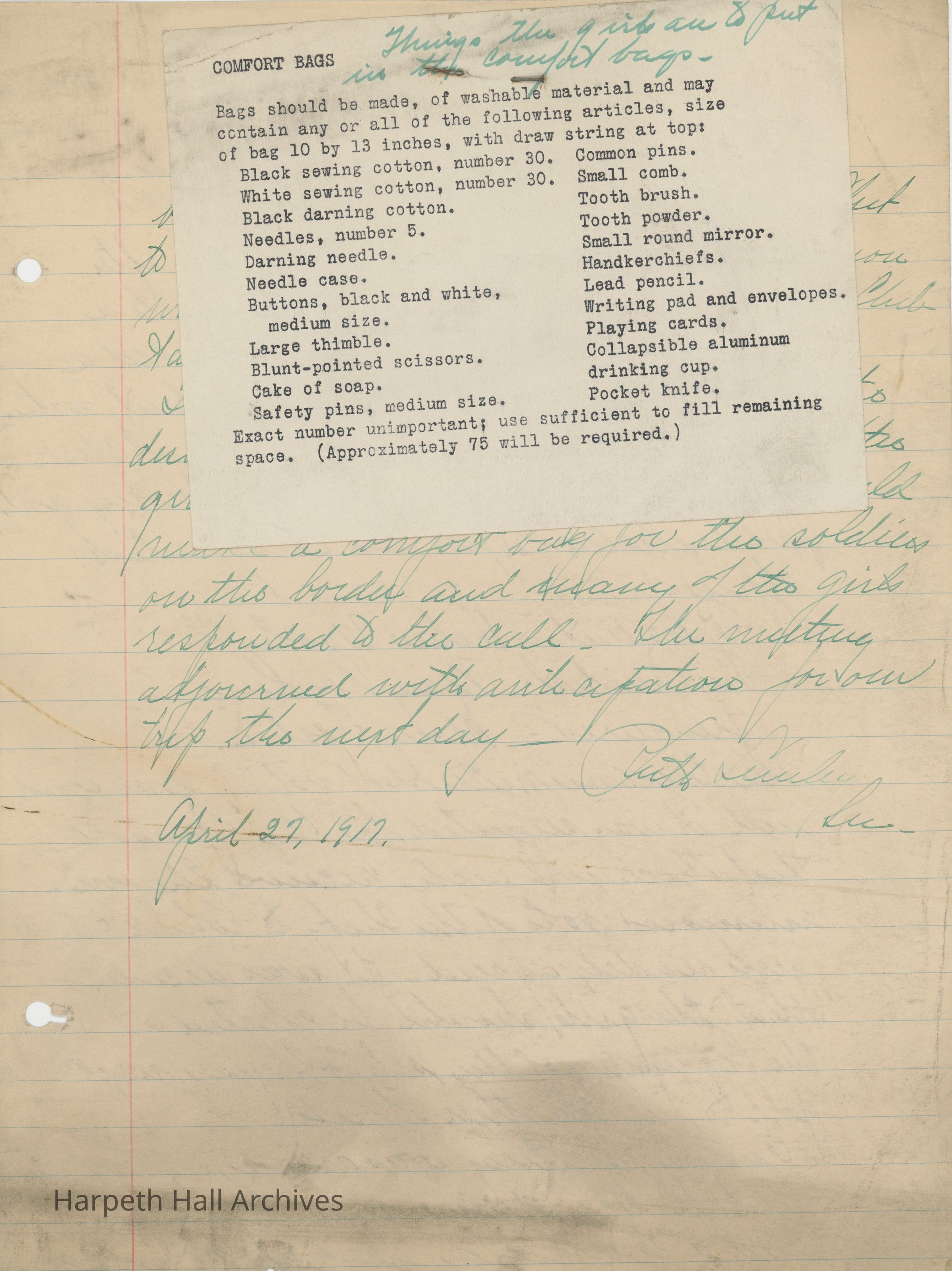 The handwritten document, dated April 27, 1917, states the following: “The president put before the club the desire of the Red Cross to have each of the girls or as many as possible could make a comfort bag for the soldiers on the border and many of the girls responded to the call.” A card with typed instructions for assembling the bags ("things the girls are to put in the comfort bags") is pinned to the document.Context