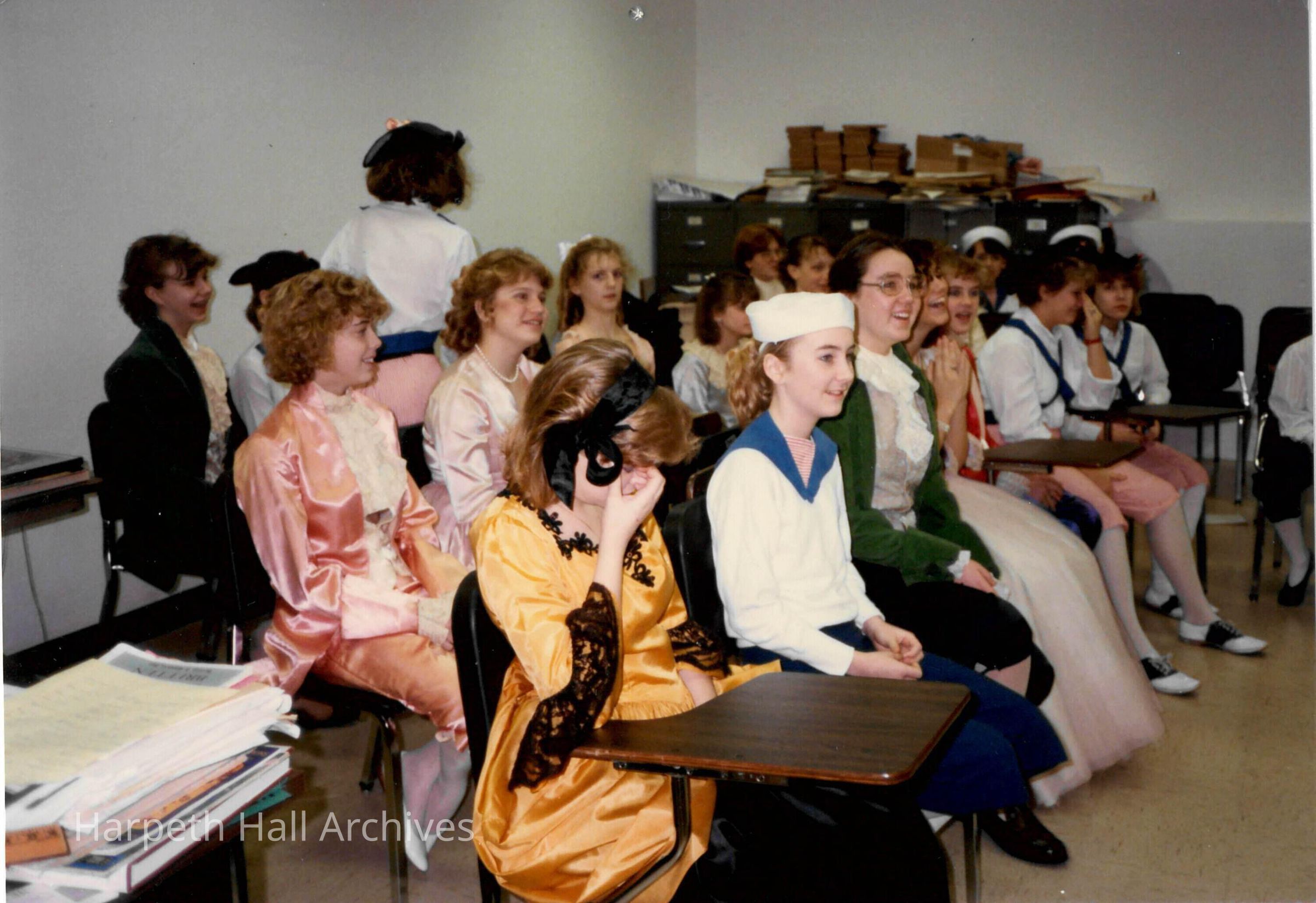 A group of seventh grade students in costume preparing for the George Washington Day Celebration.Context