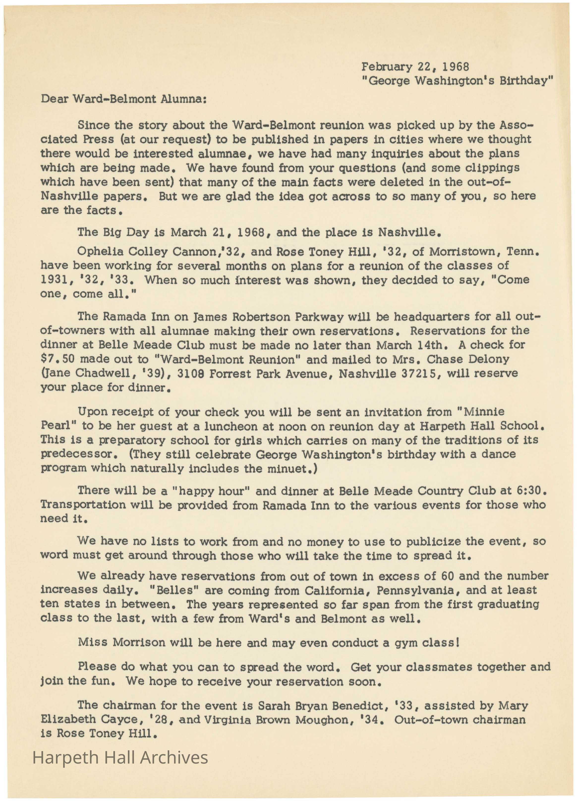 Letter detailing events scheduled for the 1968 Reunion Events.