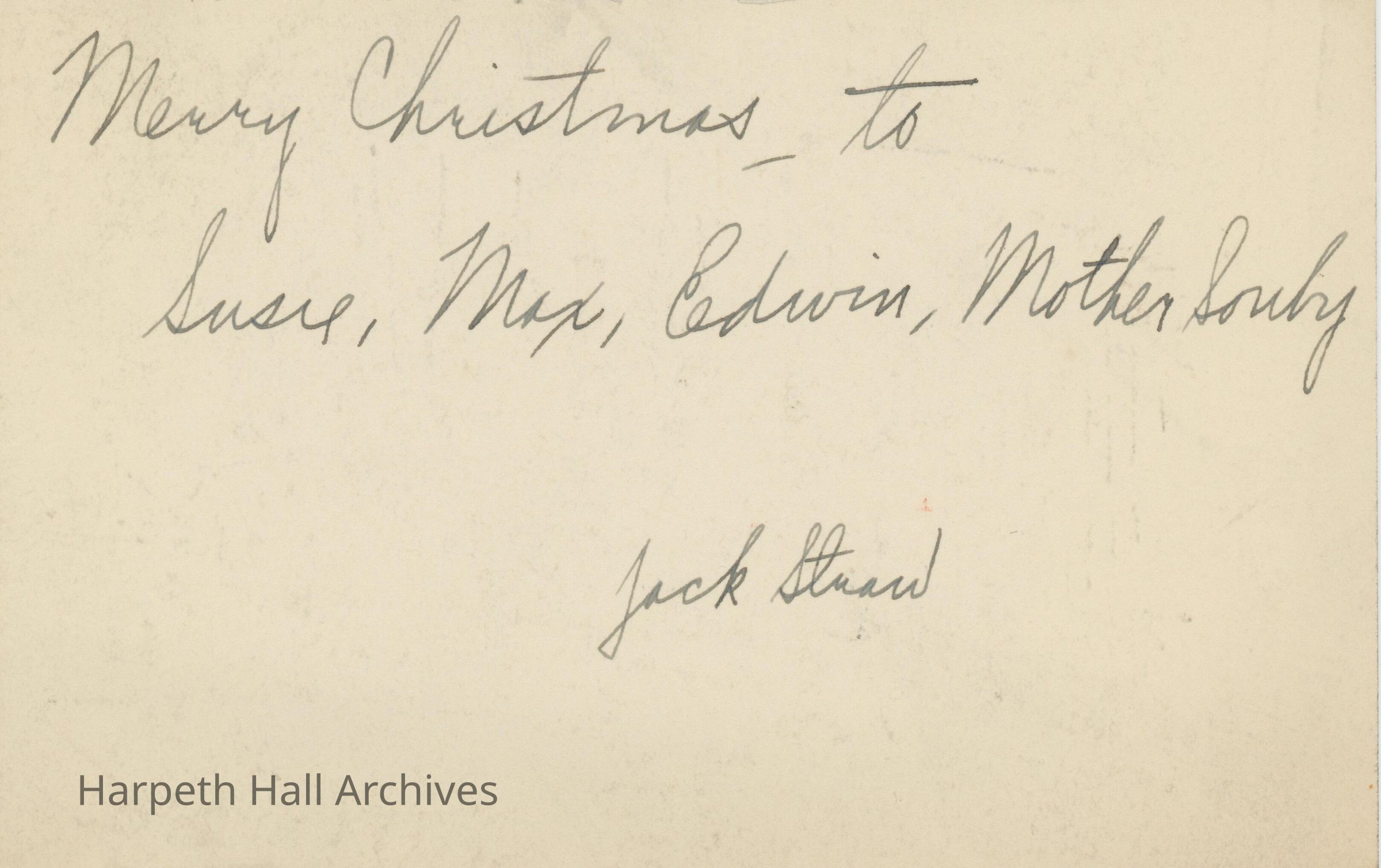 A postcard addressed to Mrs. Susan Souby and her family for Christmas.Context