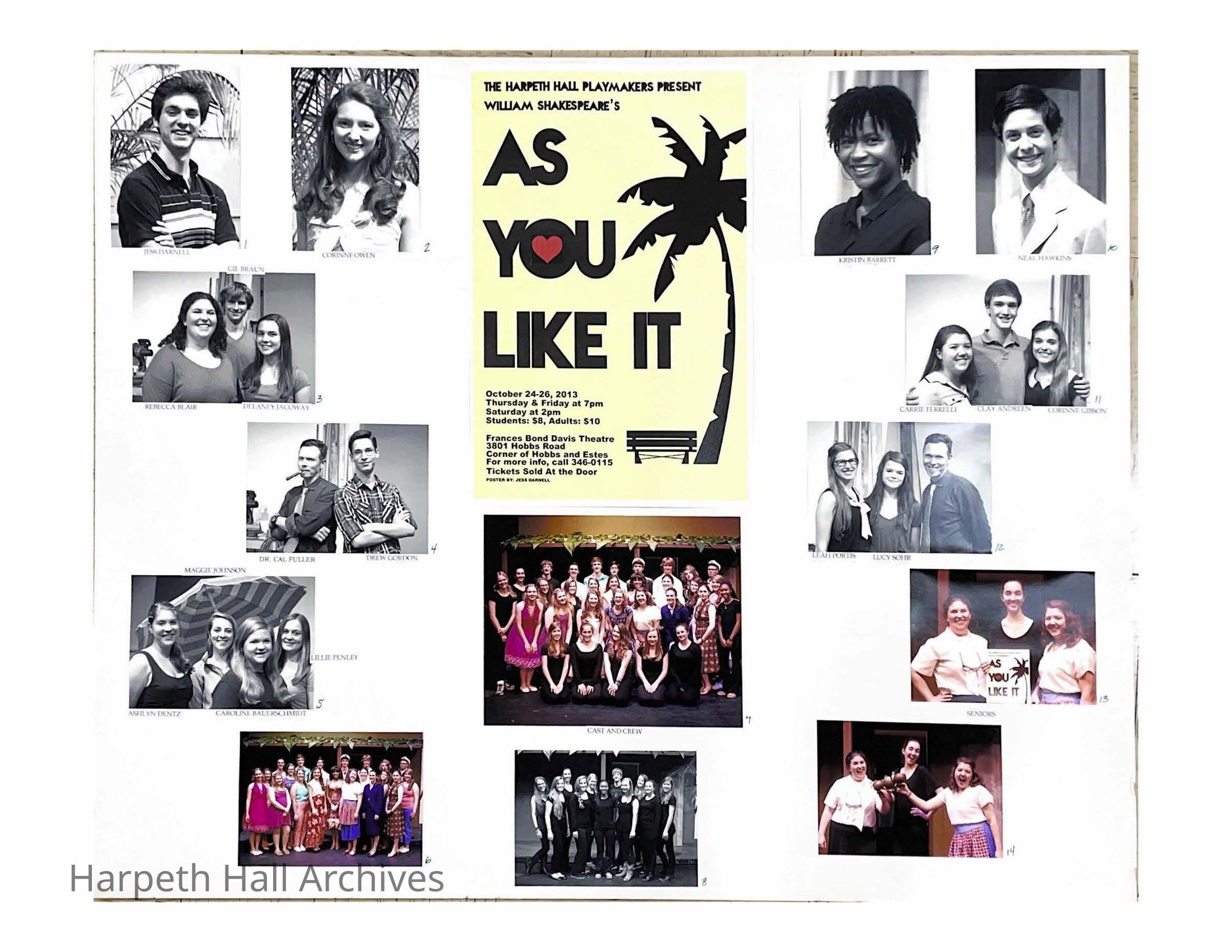 The cast board for the showing of As You Like It put on by the Harpeth Hall Playmakers in October of 2013.